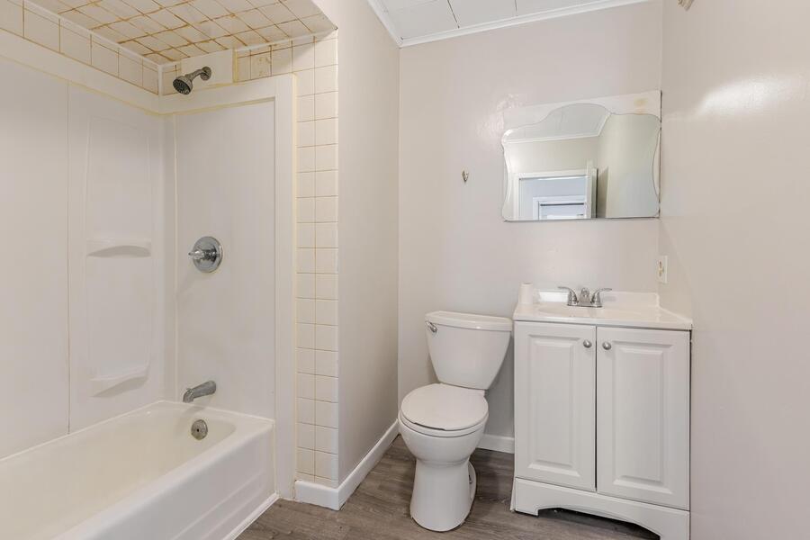 The bathroom is generously sized and features a convenient shower/tub combination, complemented by a sleek vanity that adds a modern touch while offering additional storage.