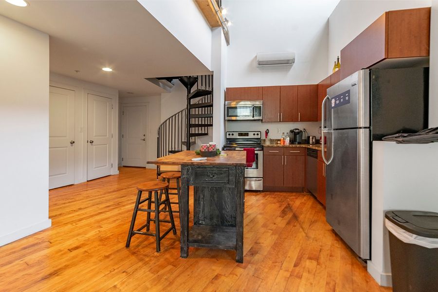 This gorgeous bi-level 2 bedroom, 1 bathroom unit features historic details and modern amenities! Features include exposed beams, hardwood floors, oversized double pane windows and plenty of storage. The fully renovated kitchen includes granite counter tops, a stainless steel refrigerator, electric range/oven, dishwasher and microwave. The full bathroom includes a tub/shower and granite vanity. Up the spiral staircase, you'll find the second floor lofted bedroom. You control air conditioning and heating with an energy efficient mini split systems. Enjoy direct access to the biking/hiking river trail and the convenience of walking down Main Street for all the best entertainment that Manayunk has to offer.