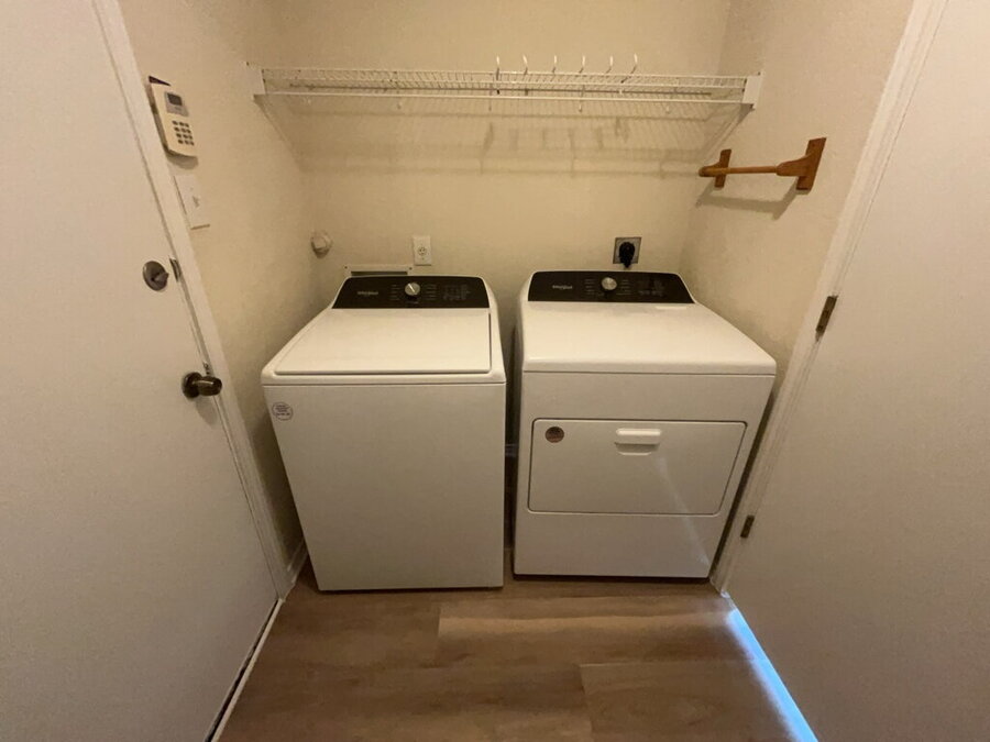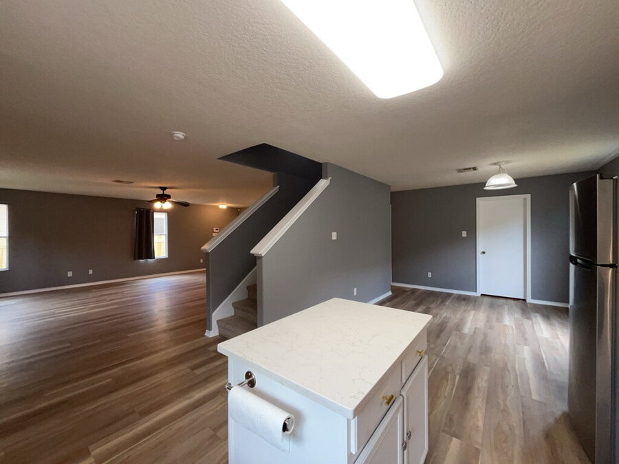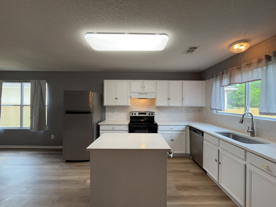 The kitchen is both functional and welcoming, complete with an eat-in area, island, pantry, dishwasher and an electric stove with a sleek glass cooktop. A refrigerator is also included, making move-in a breeze. Just off the kitchen, the laundry room comes equipped with a washer and dryer for added convenience.