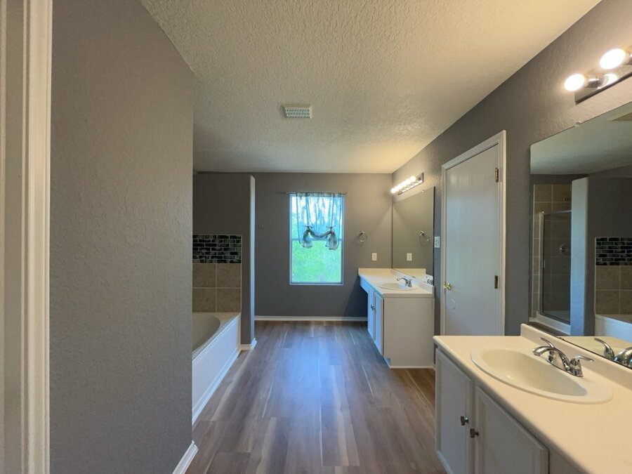 Upstairs, the spacious primary suite offers a private retreat with an ensuite bath featuring a garden tub, walk-in shower, multiple vanities and a generous walk-in closet.