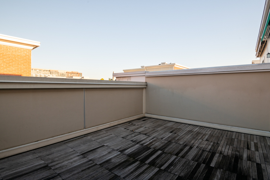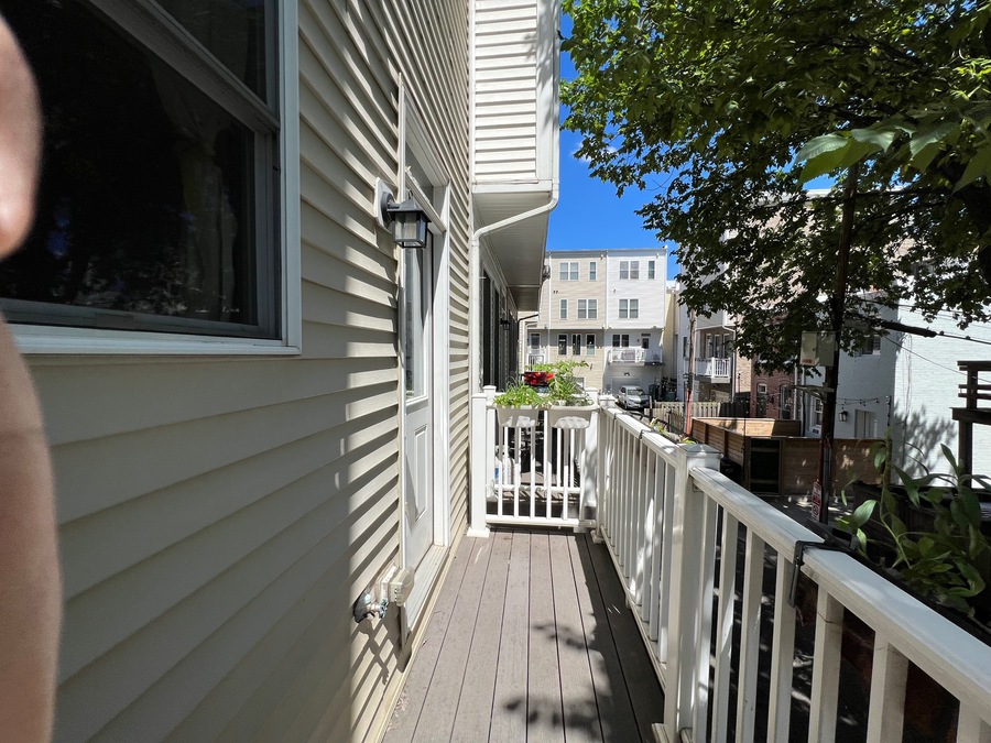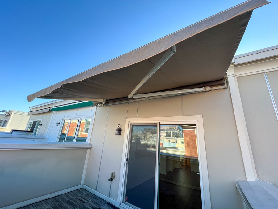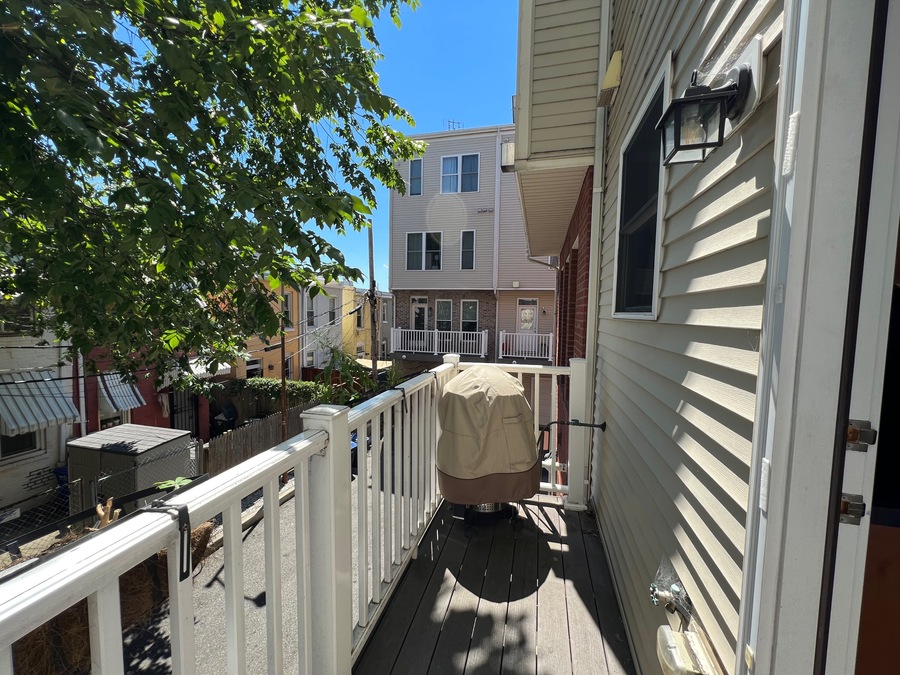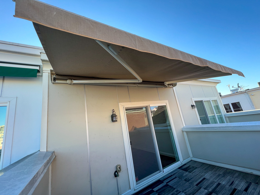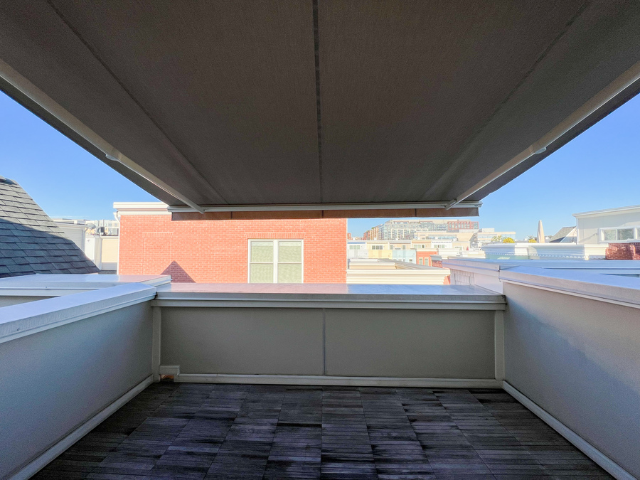 The bedrooms are spacious and feature ample closet space. There are two bedrooms on the middle level and one additional bedroom on the top floor, which also has its own bathroom. The home boasts two balconies, including one off the top floor with a remote-controlled awning.