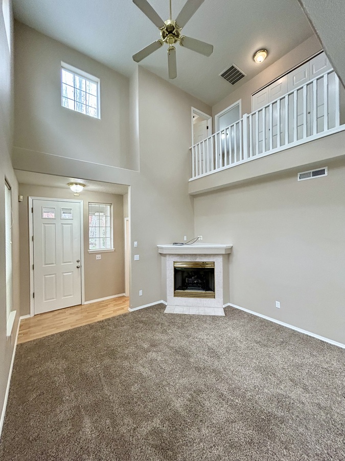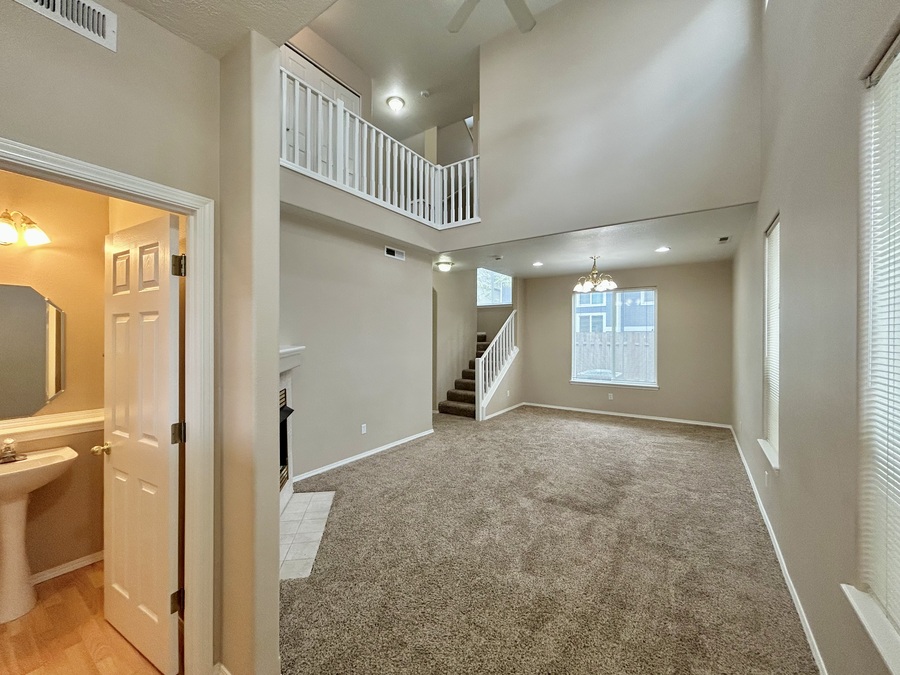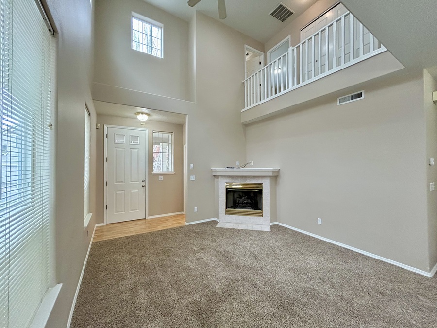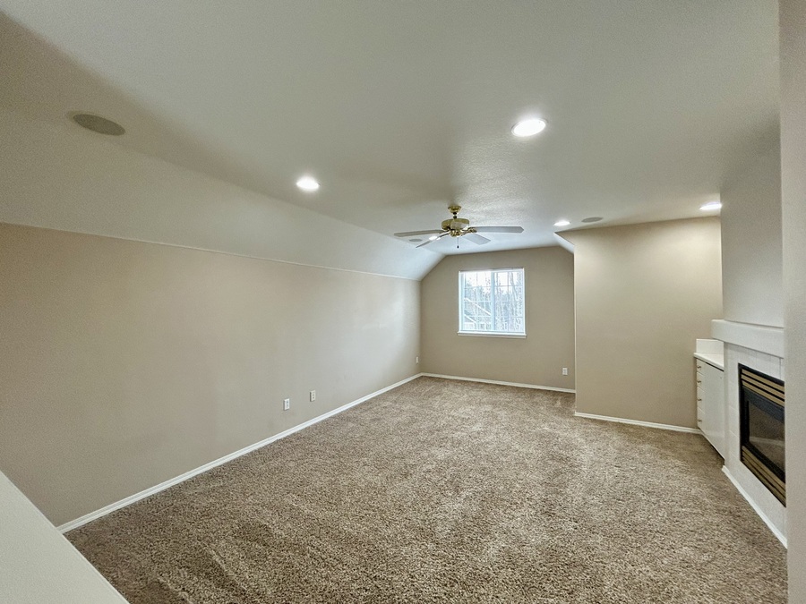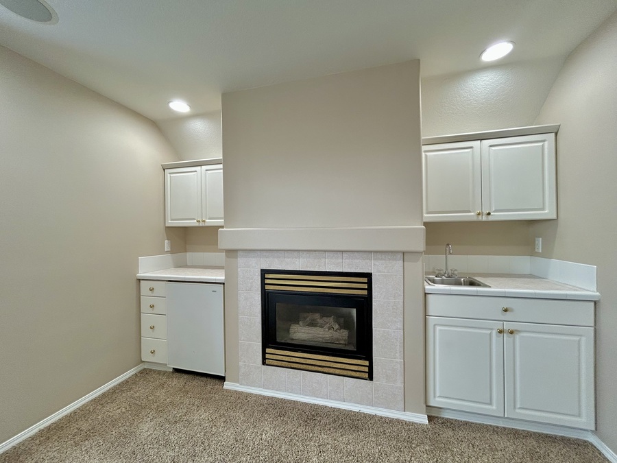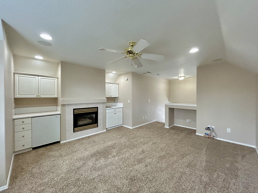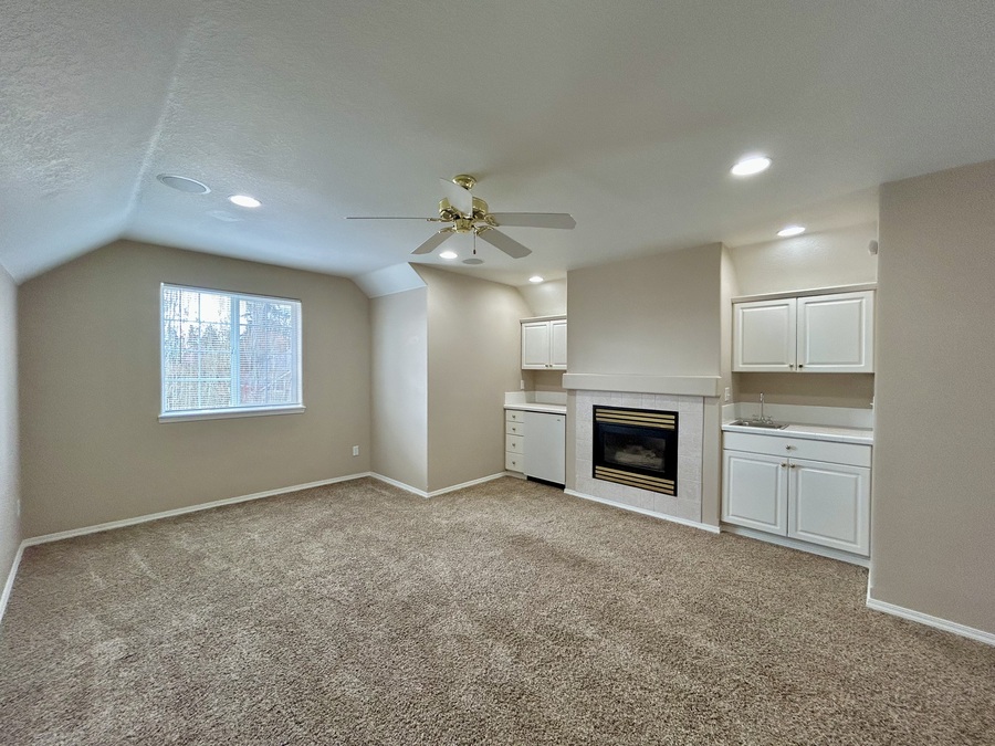 The upstairs bonus room, complete with a cozy gas fireplace, offers the perfect space to unwind (please note the mini fridge is non-operable). The easy-care yard and back patio make outdoor living a breeze, while the downstairs fireplace adds a touch of charm (cosmetic only).