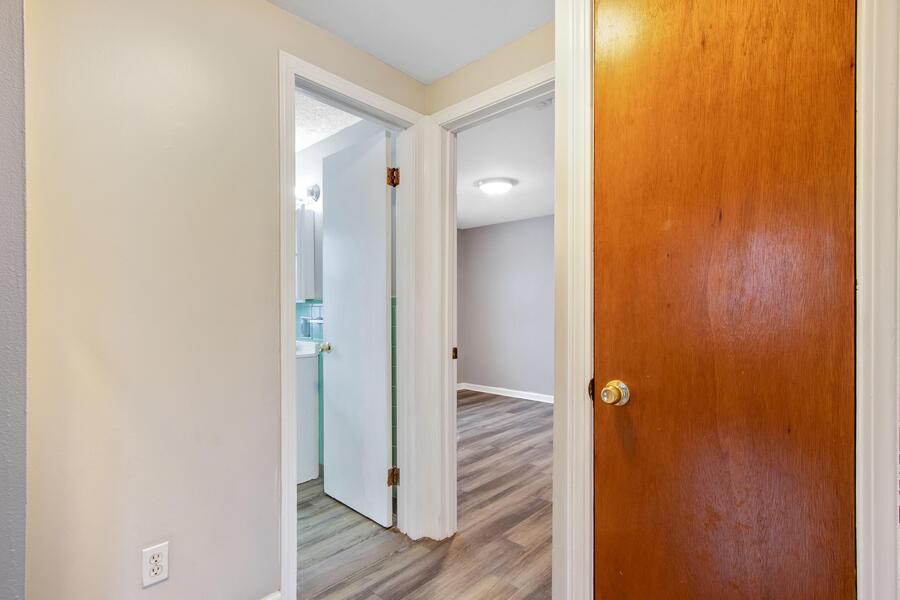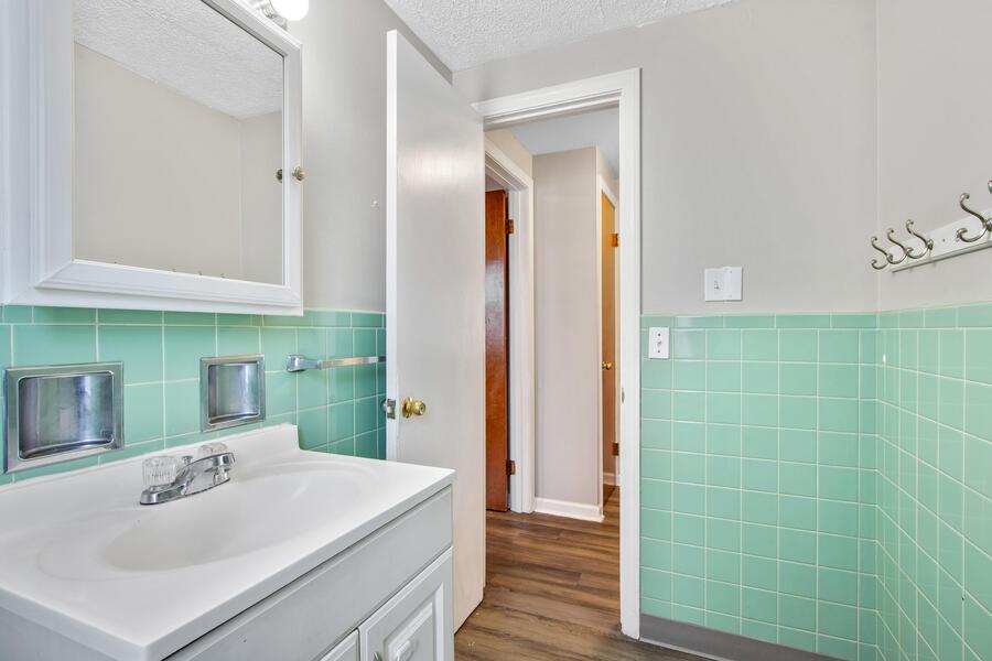 In the bathroom, you’ll find a clean white vanity and a wall-mounted mirrored medicine cabinet for convenient storage, along with a tub/shower combo surrounded by mint green tile that adds classic character. Both bedrooms include closets for storage, and laundry hookups are available in the basement common area.