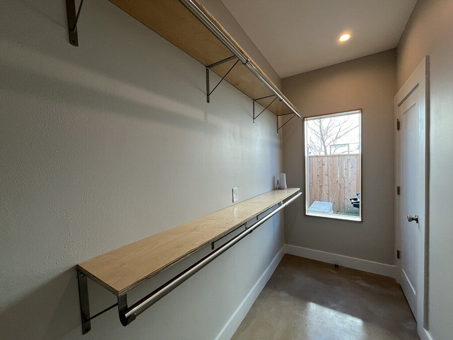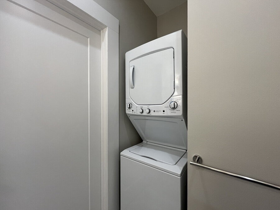 Downstairs, the primary bedroom offers a walk-in closet. A private bath with a double vanity and relaxing garden tub and a full laundry setup with stacked washer and dryer for added convenience. The second bedroom includes multiple closets, providing excellent storage options.