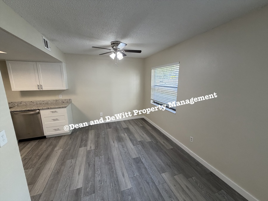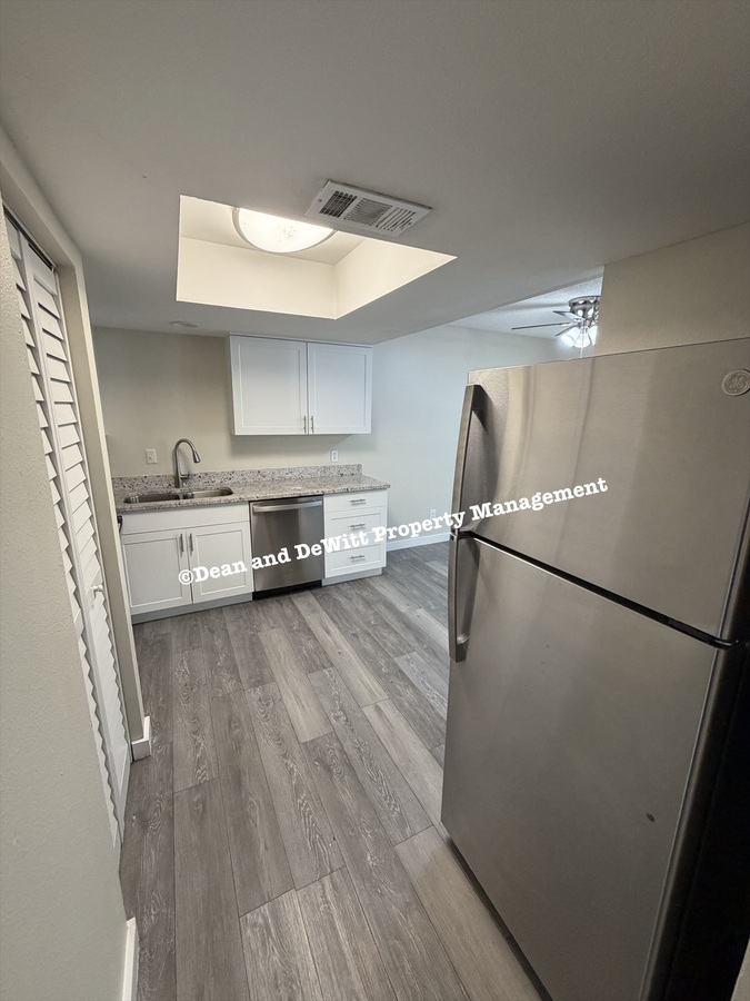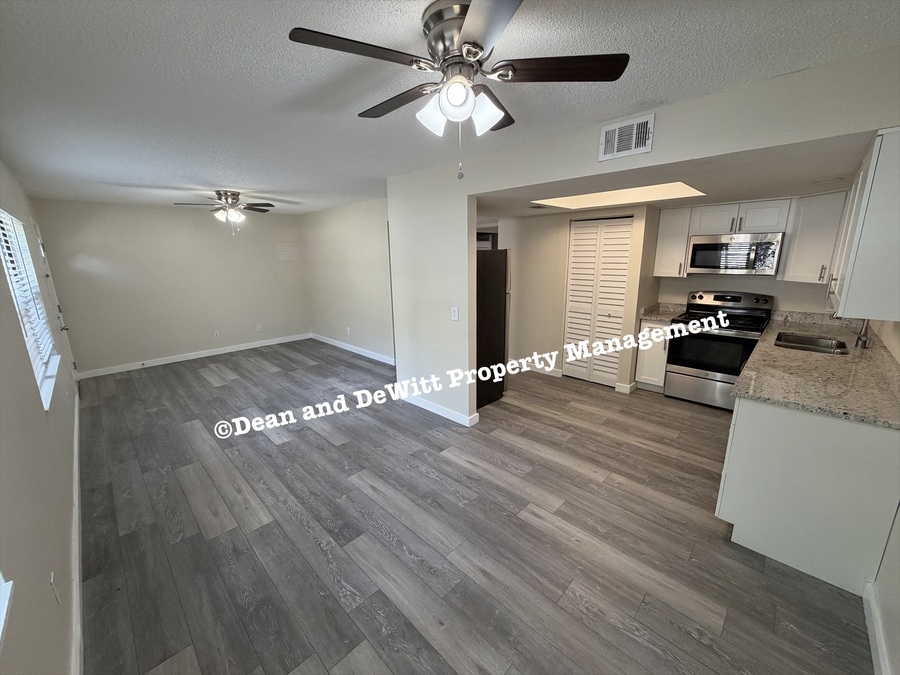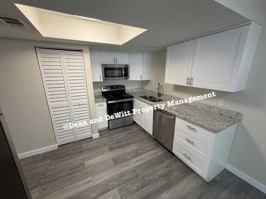 Appliances include stainless steel refrigerator, stove, microwave and dishwasher