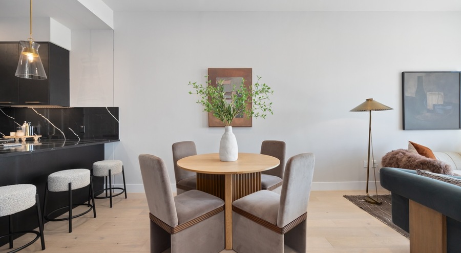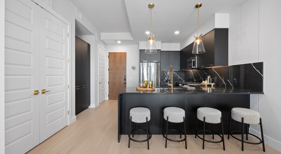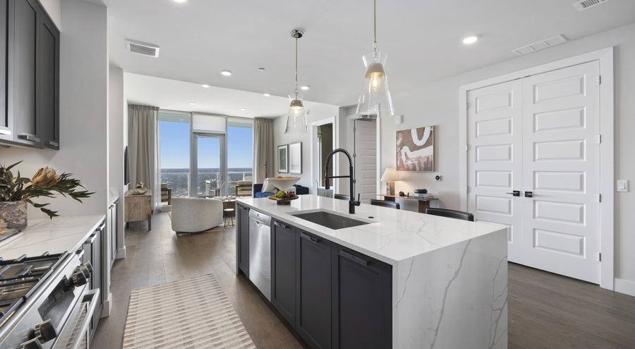 This sleek high-rise community offers a selection of spacious studio, one-, and two-bedroom residences thoughtfully designed for modern living. Interiors boast high-end finishes including quartz countertops, stainless steel appliances, and chic matte fixtures—all set against elegant wide-plank flooring and expansive windows that bring in abundant natural light. Open-concept layouts enhance flow between kitchens and living spaces, while spa-inspired bathrooms and in-unit washers and dryers add everyday convenience. Residents have access to a curated suite of resort-style amenities geared toward wellness, work, and relaxation. A rooftop lounge and terrace provide panoramic city views, with cozy seating, fire pits, and outdoor grilling perfect for entertaining. A state-of-the-art fitness center features both cardio and strength-training equipment, while stylish co-working lounges and reservable conference rooms support productive remote work. Pet owners will appreciate the on-site dog park and washing station, and secure garage parking ensures ease and peace of mind. Extra touches include 24/7 concierge service, secure keyless entry, energy-efficient systems, and green-living initiatives—ideal for those seeking a sophisticated urban lifestyle with community and convenience.