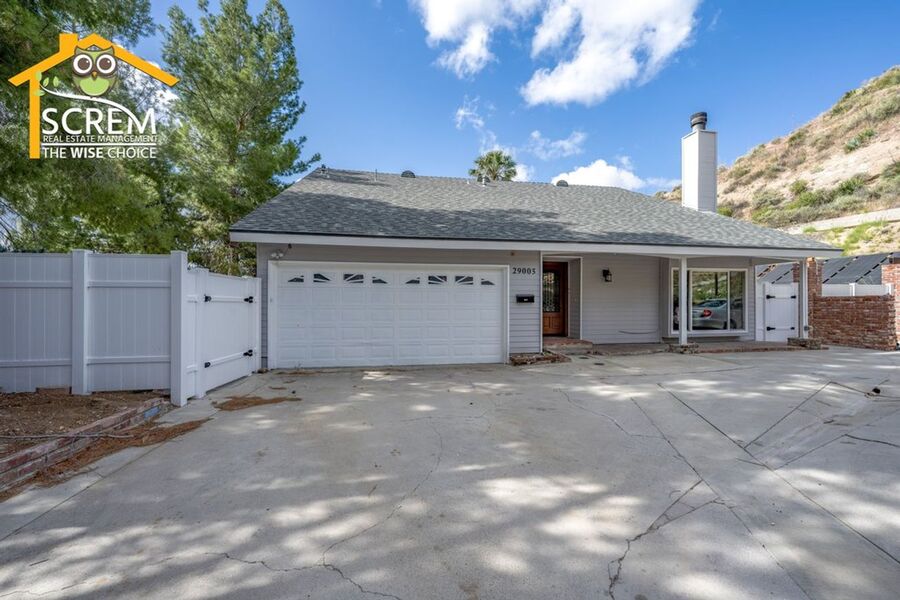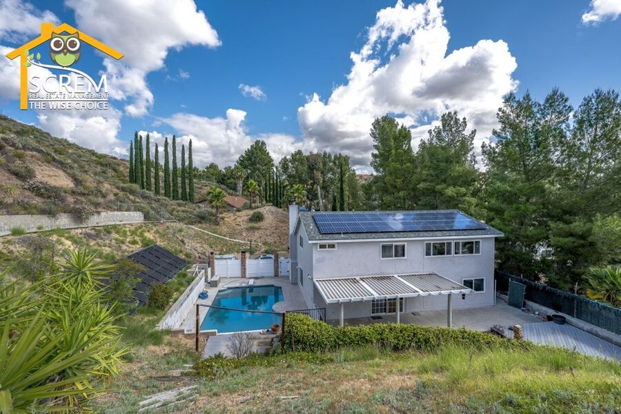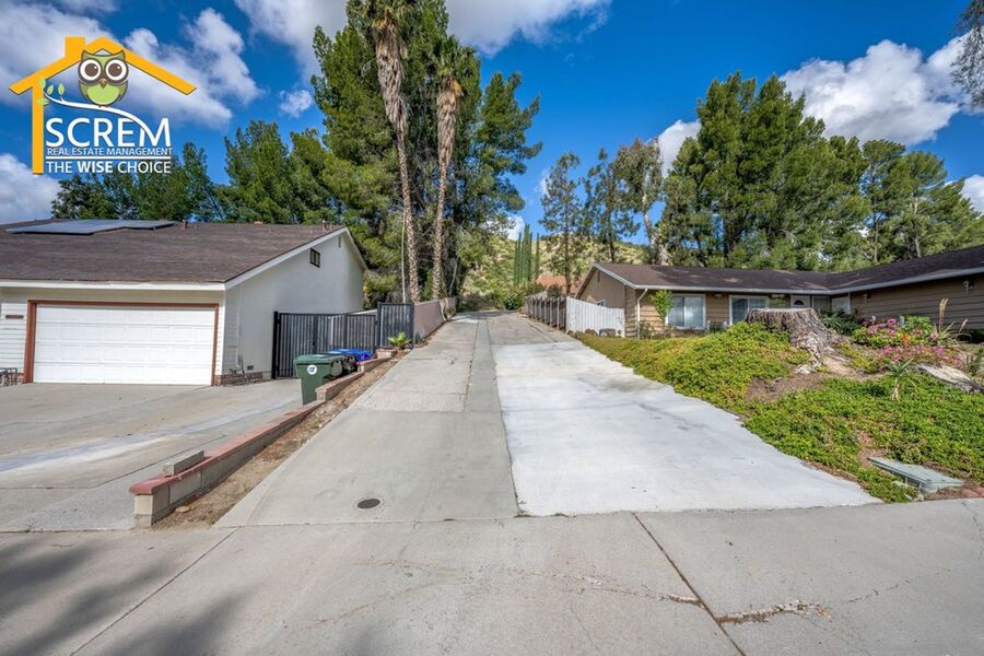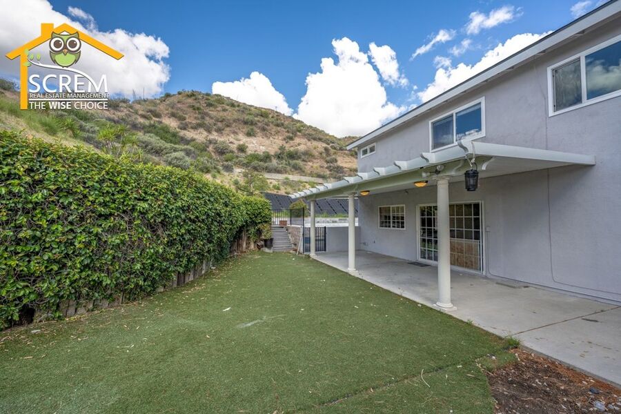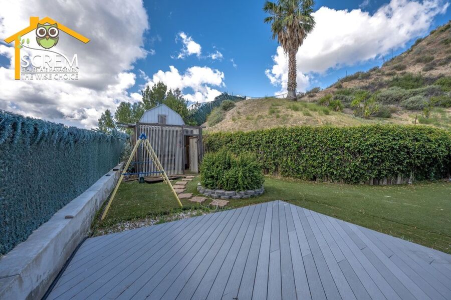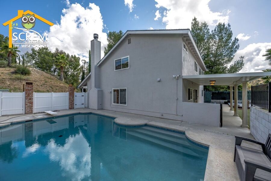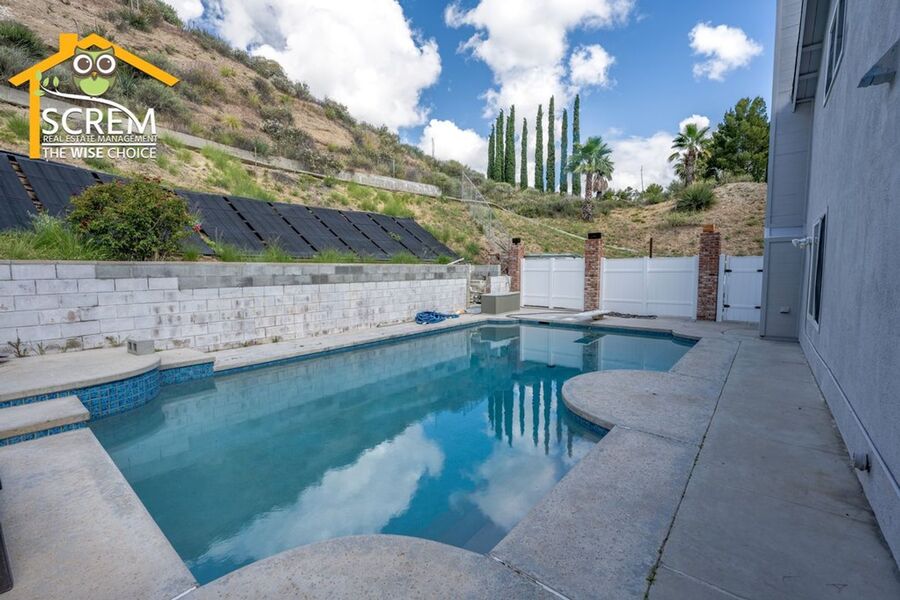 Beautiful four-bedroom, three-bathroom pool home located on a quiet flag lot in Canyon Country. This inviting home features soaring vaulted ceilings, an open-concept living and family room with wood flooring, a cozy fireplace with mantel, recessed lighting, and built-in shelving. The dining area includes a ceiling fan and additional built-in storage and flows seamlessly into the upgraded kitchen, complete with granite countertops, white cabinetry with brushed-silver hardware, a convenient breakfast bar, and essential appliances, including an electric stove, single oven, microwave, and dishwasher. Off the kitchen is the family room with sliding glass doors to a private backyard retreat featuring beautiful mountain views, a storage shed, and a private sparkling pool. Downstairs, you’ll find one bedroom with carpet flooring and easy access to a bathroom with a walk-in shower, perfect for guests or a home office setup. Upstairs features a spacious primary suite with double-door entry, ceiling fan, walk-in closet with built-in storage, and an attached bathroom with a relaxing Jacuzzi tub and a separate walk-in shower. Two additional guest bedrooms are also upstairs. One with a ceiling fan, the other bedroom has a built-in desk, instead of a closet. Both bedrooms share a convenient Jack-and-Jill bathroom with dual sinks. Additional highlights include fresh paint, new carpets, an indoor laundry area with washer and dryer hookups, an attached two-car garage, and RV hookups. Conveniently close to shopping, restaurants, and the 14 freeway. *Owner may consider a pet.