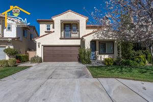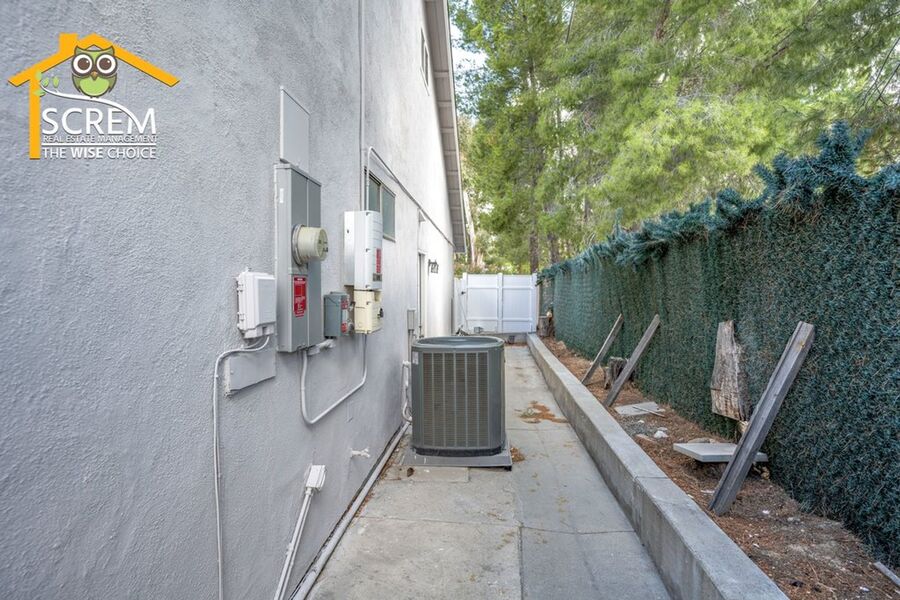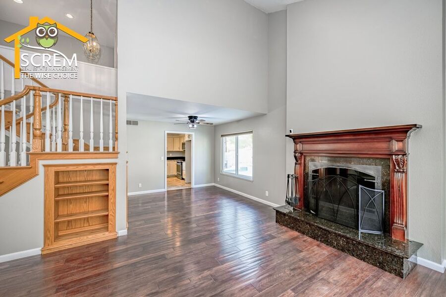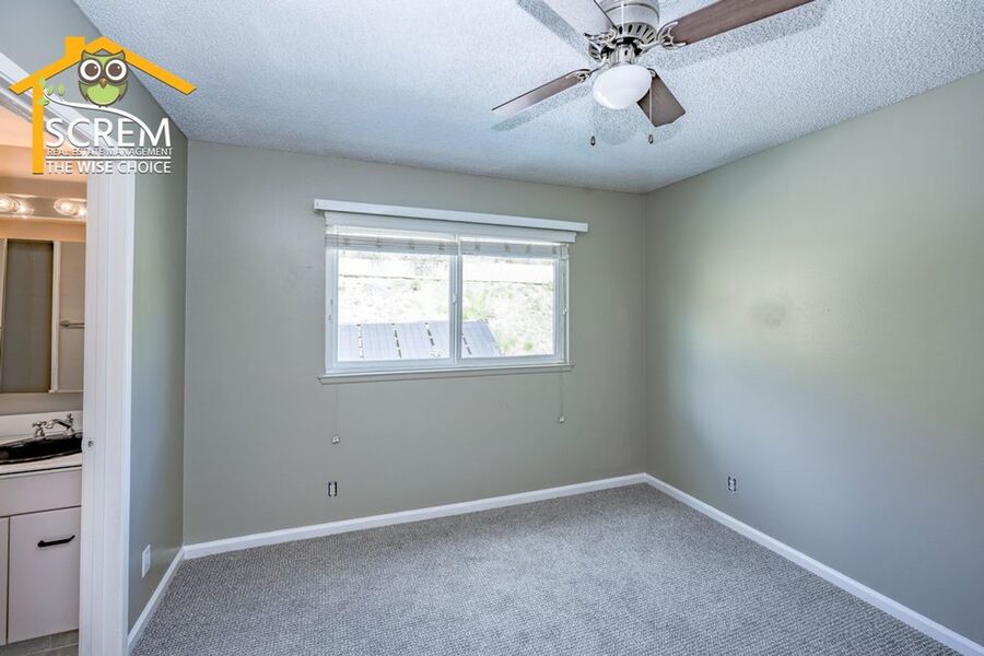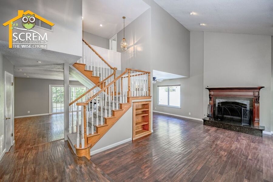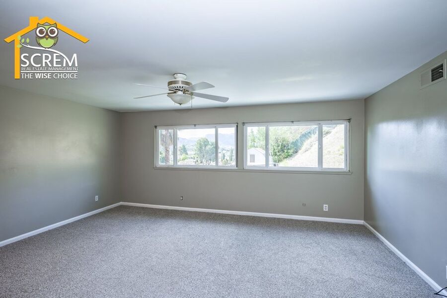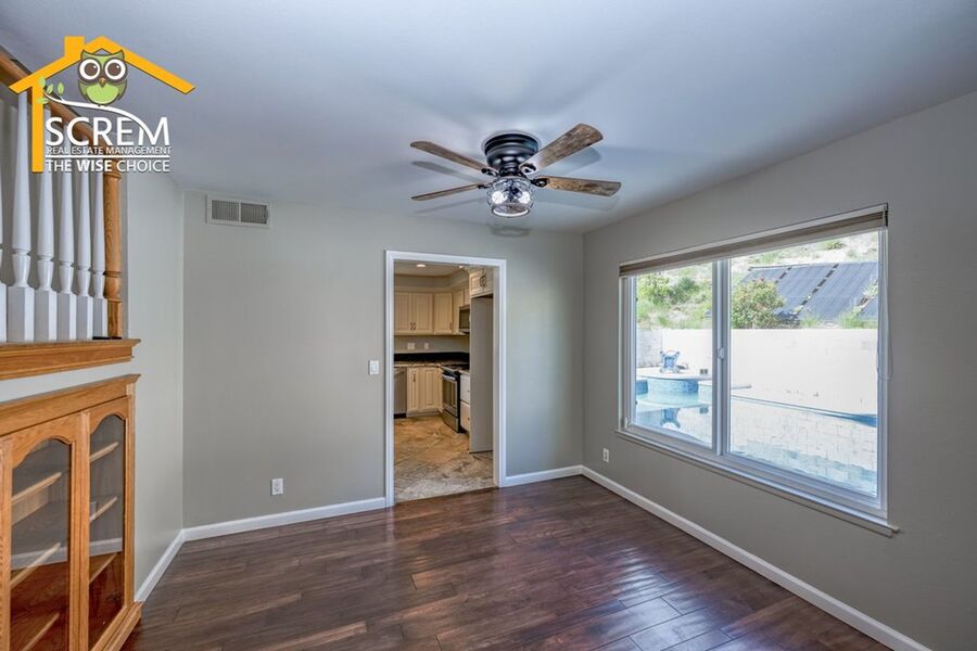 Beautiful four-bedroom, three-bathroom pool home located on a quiet flag lot in Canyon Country. This inviting home features soaring vaulted ceilings, an open-concept living and family room with wood flooring, a cozy fireplace with mantel, recessed lighting, and built-in shelving. The dining area includes a ceiling fan and additional built-in storage and flows seamlessly into the upgraded kitchen, complete with granite countertops, white cabinetry with brushed-silver hardware, a convenient breakfast bar, and essential appliances, including an electric stove, single oven, microwave, and dishwasher. Off the kitchen is the family room with sliding glass doors to a private backyard retreat featuring beautiful mountain views, a storage shed, and a private sparkling pool. Downstairs, you’ll find one bedroom with carpet flooring and easy access to a bathroom with a walk-in shower, perfect for guests or a home office setup. Upstairs features a spacious primary suite with double-door entry, ceiling fan, walk-in closet with built-in storage, and an attached bathroom with a relaxing Jacuzzi tub and a separate walk-in shower. Two additional guest bedrooms are also upstairs. One with a ceiling fan, the other bedroom has a built-in desk, instead of a closet. Both bedrooms share a convenient Jack-and-Jill bathroom with dual sinks. Additional highlights include fresh paint, new carpets, an indoor laundry area with washer and dryer hookups, an attached two-car garage, and RV hookups. Conveniently close to shopping, restaurants, and the 14 freeway. *Owner may consider a pet.