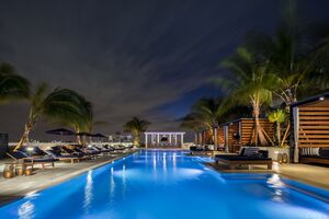 Rooftop resort style pool with resident cabanas, bar and BBQ area