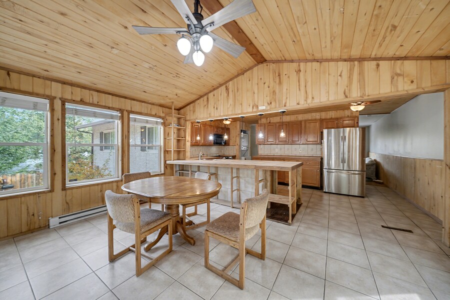 Step inside to discover a warm wood floors and vaulted ceilings! The kitchen is truly the heart of the home—complete with an oversized island, stainless steel appliances, abundant cabinetry, beautiful wooden paneled walls and an abundance of windows giving a cabin life feel.