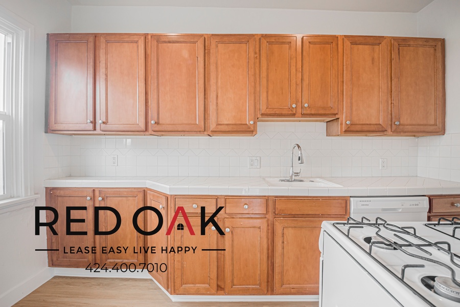 ~ Kitchen: Hardwood cabinets, tile countertops & essential appliances.