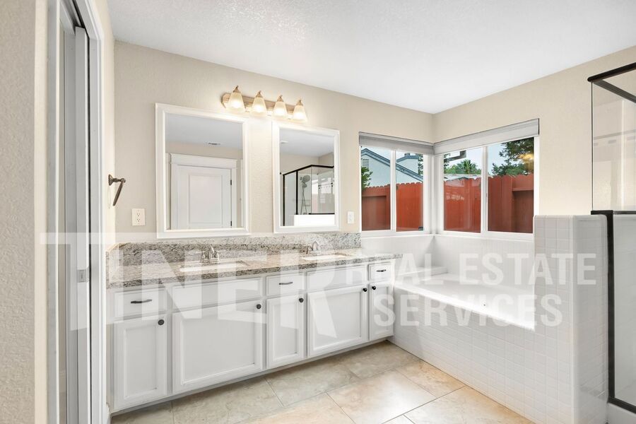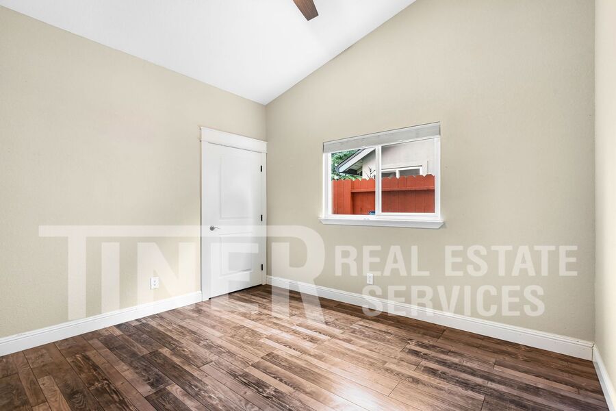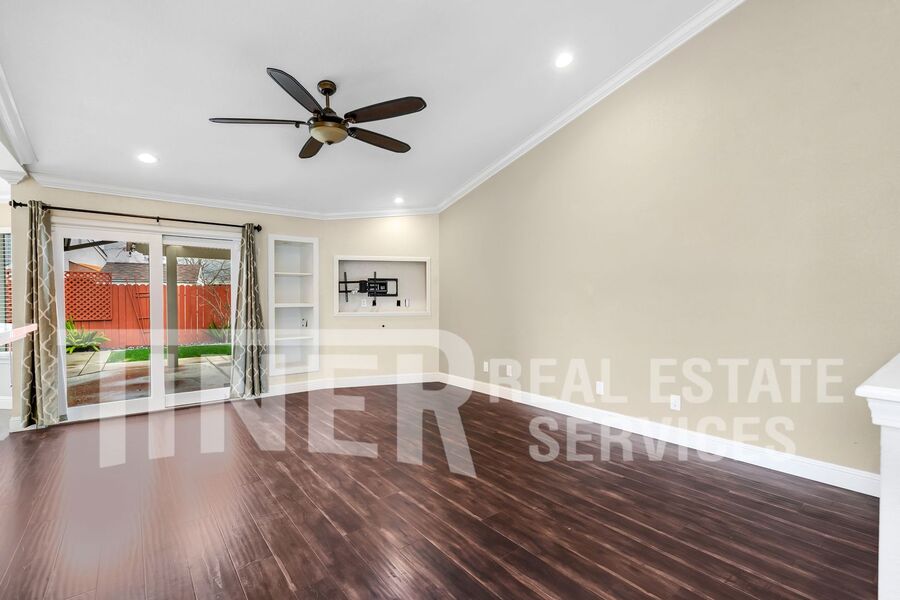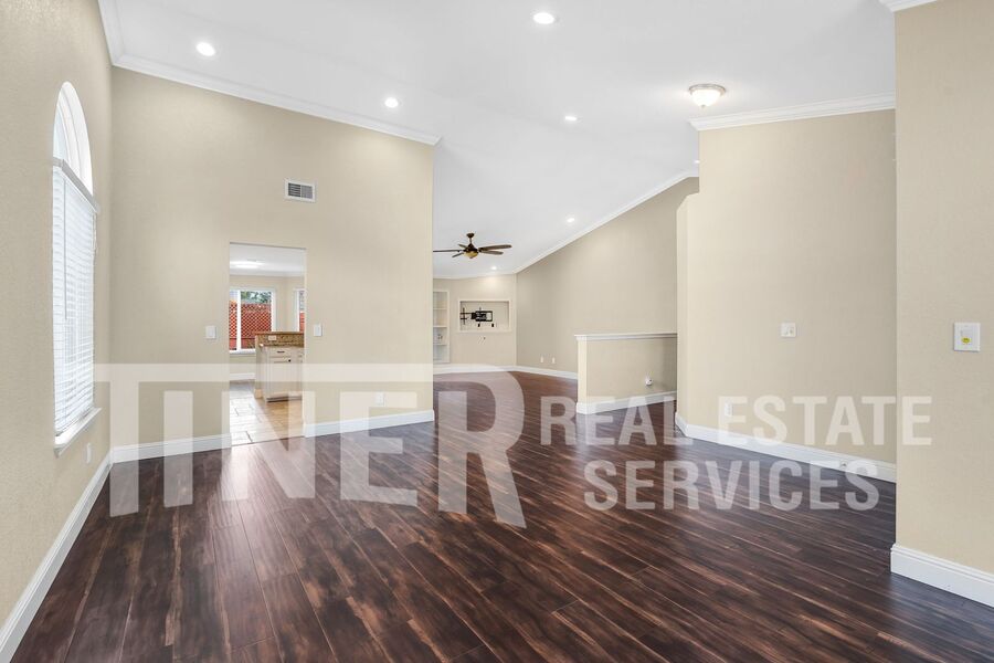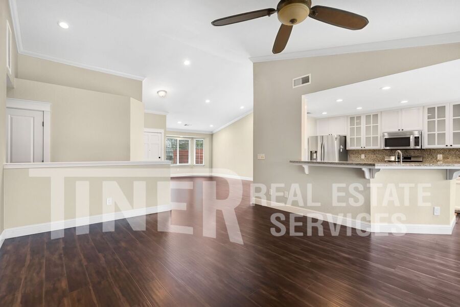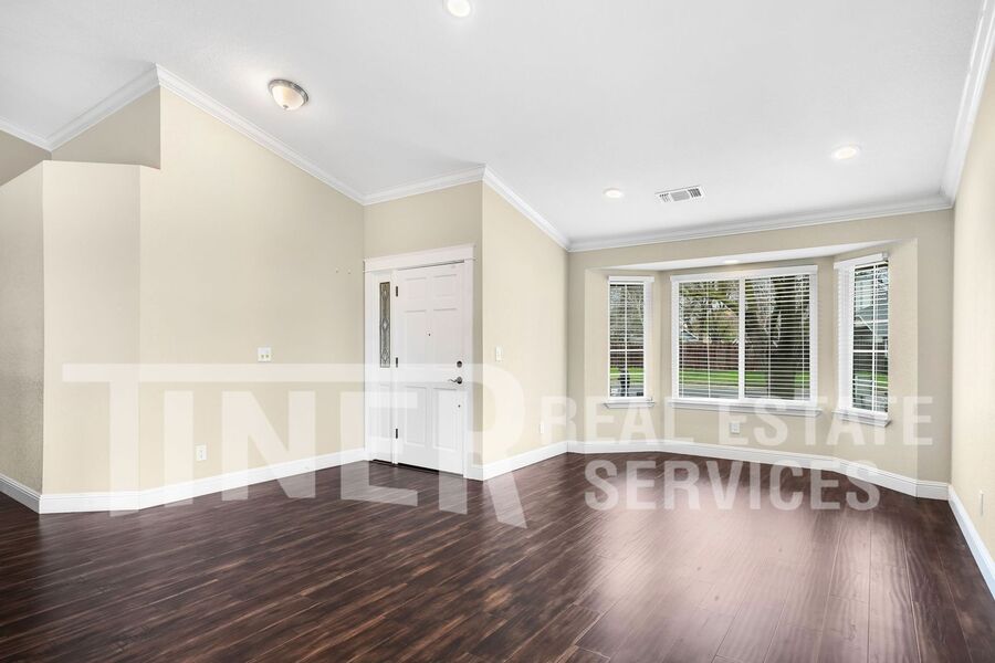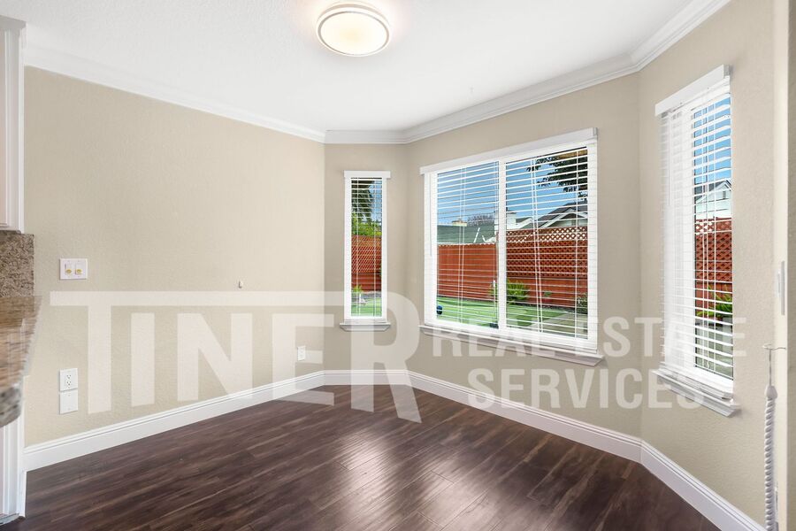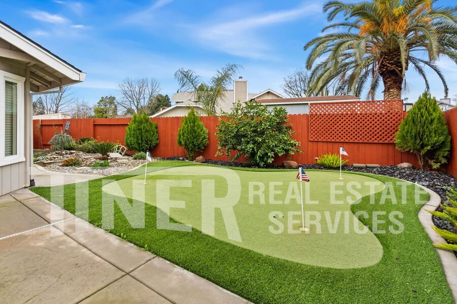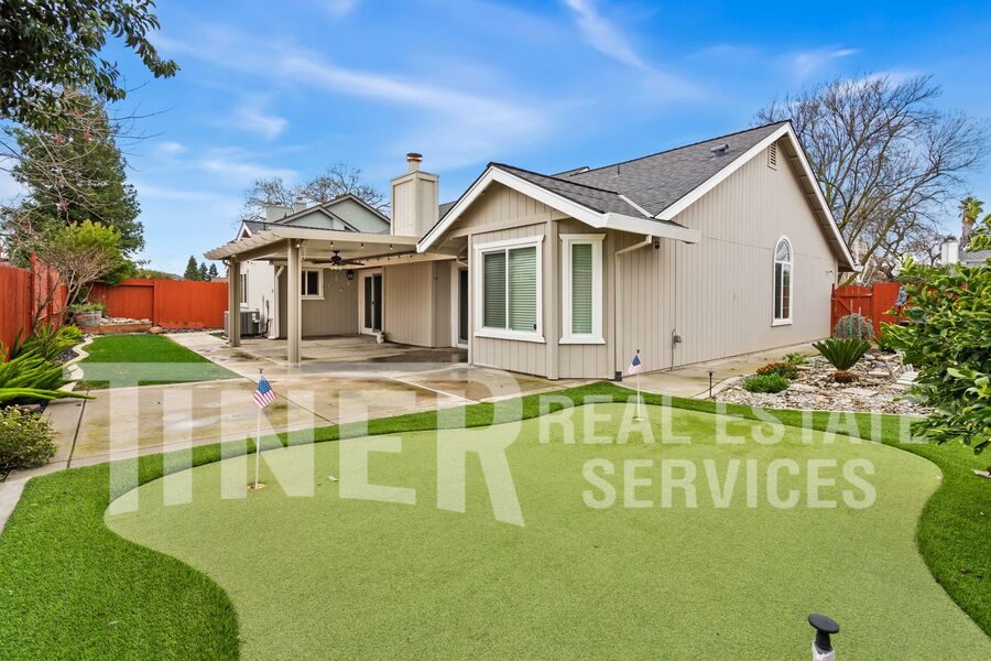 What a wonderful place to call home! Entry opens to sizeable open area concept living and family room. Tons of natural light with a bay window facing out to the pristine front yard. The modern kitchen features stainless steel appliances, dining bar and recessed lighting. A spacious dining area overlooks the rear yard. The primary suite features a slider with access to the backyard, 2 walk-in closets, and a private bath with a soaking tub, a walk-in shower, and dual vanities. Indoor laundry room with washer and dryer. 3 car attached garage provides plenty of parking and storage. Single-story home with whole house fan, hardwood flooring, overhead lighting, ceiling fans, central heat and air, dual pane windows, and faux wood slat blinds throughout. The backyard is an absolute delight. The covered patio with ceiling fan looks out over the meticulous landscaping and features your own putting green. Desirable area of Laguna with local Lichtenberger Park. Close to great shopping locations. It has a great school district and easy access to Hwy-99 and I-5. Gardening service is included.