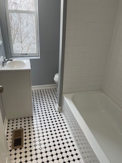 Enjoy the comfort of brand-new bathrooms featuring stylish subway tile and a kitchen outfitted with sleek white shaker cabinets, generous cabinet and counter space, and stainless steel appliances that will be installed prior to move-in.