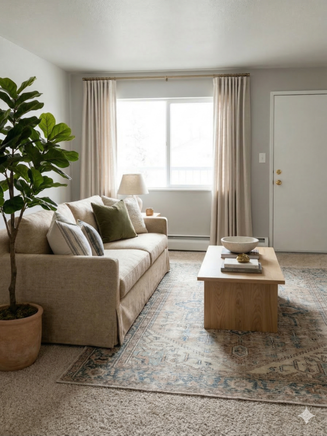 - Bright living room with large windows