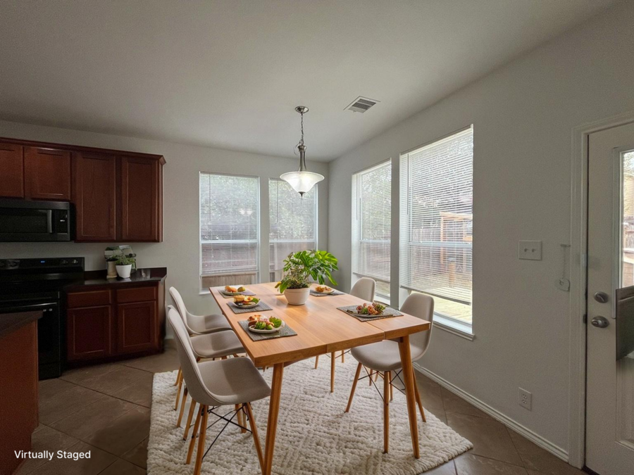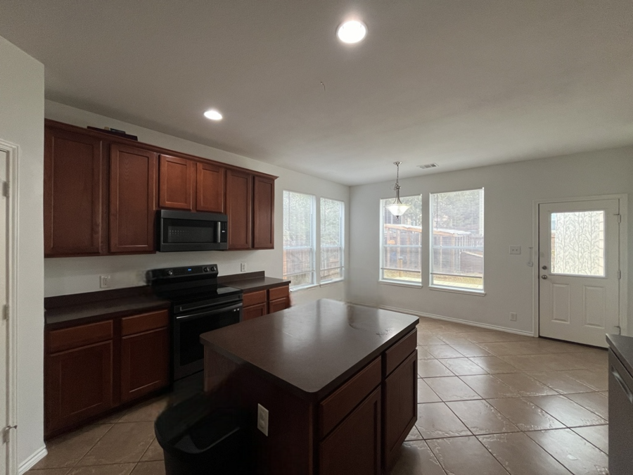 The kitchen is the heart of the home, featuring solid countertops, a center island, pantry and an eat-in dining area. It comes fully equipped with an electric stove, dishwasher, microwave, and plenty of storage, making it ideal for both everyday meals and entertaining. A dedicated laundry room with washer and dryer hookups adds extra convenience.