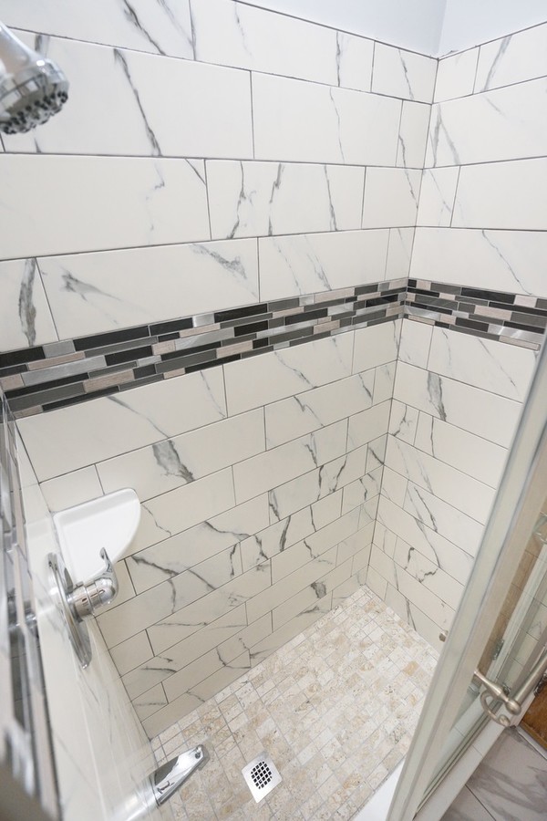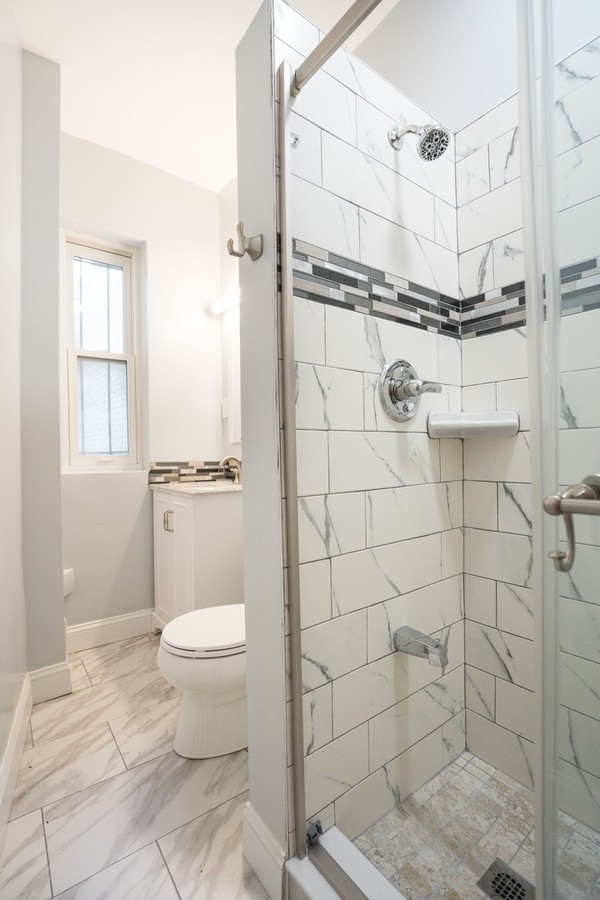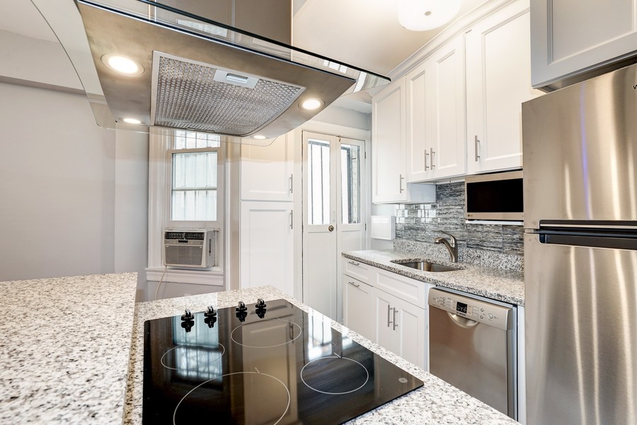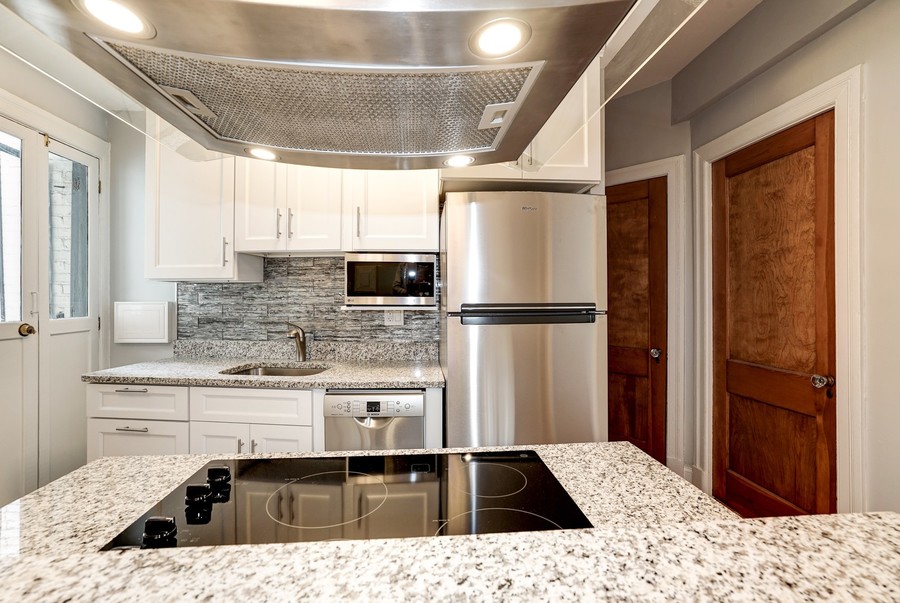 The updated kitchen is open and clean, featuring granite countertops, an island, chrome range hood, and tile backsplash. The living room is airy and filled with natural light, complemented by original wood doors that add character. An updated bathroom with a glass shower and a large bedroom complete this charming residence.