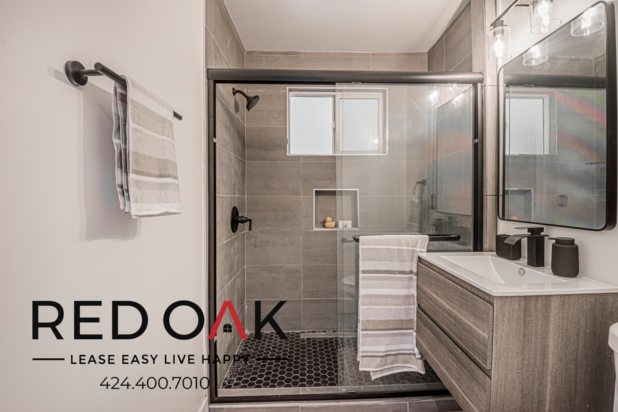 ~ Refreshing Bath: Well-lit mirror, hardwood vanity, and walk-in shower.