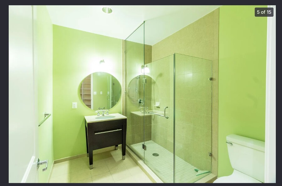 The modern kitchen includes stainless steel GE Profile appliances, and the unit comes with the convenience of an in-unit washer and dryer, abundant storage, and two full bathrooms.