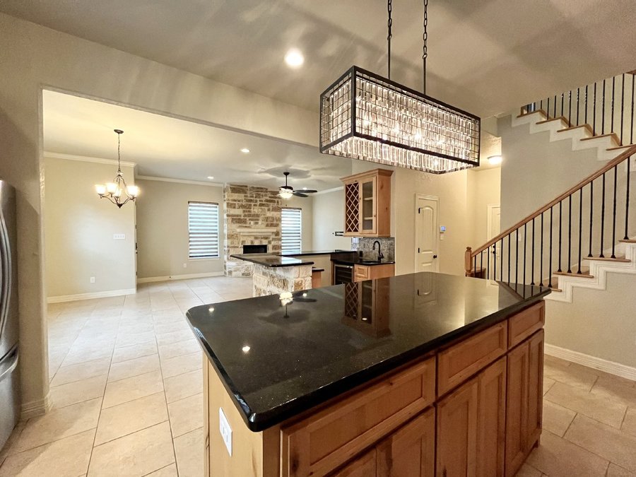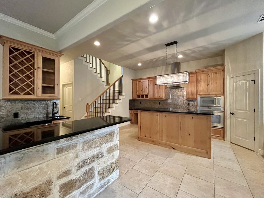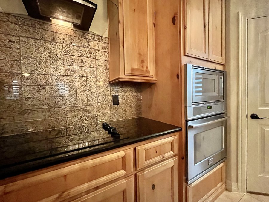 The well-appointed kitchen is a culinary delight, featuring built-in appliances including a microwave and oven, a dishwasher, a glass cooktop, a refrigerator, and a large island that provides ample counter space and a convenient breakfast bar.