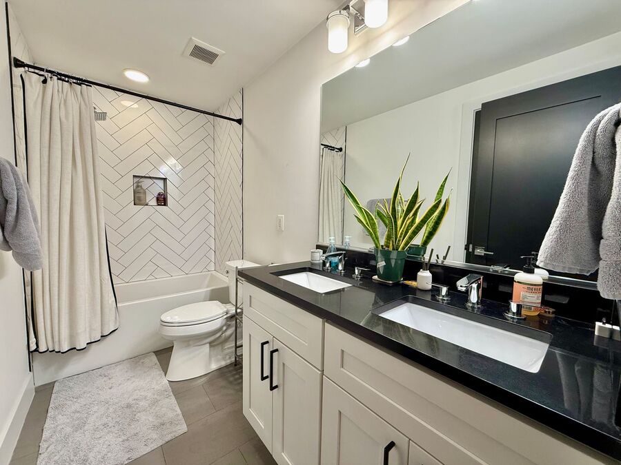 Full bathroom with dual access via hallway and the first bedroom