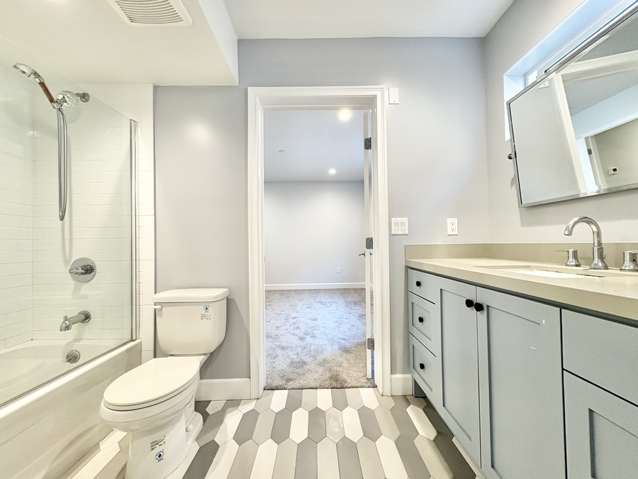 Each bedroom is generously sized, with ample closet space, making this an ideal setup for roommates, families, or anyone needing extra space for a home office. The bathrooms feature sleek fixtures and modern tile work, creating a fresh and polished feel.