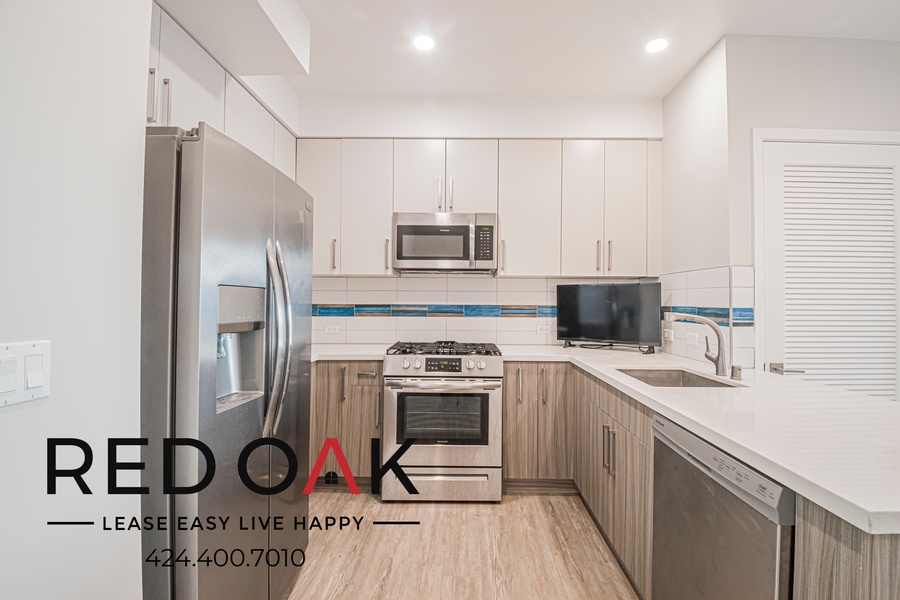 ~ Modern Kitchen: Quartz counters, breakfast bar, tile backsplash & stainless steel appliances.