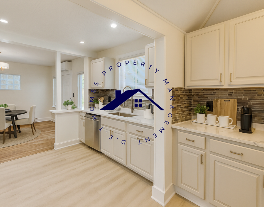 The updated kitchen boasts new cabinetry, ample counter space, and stainless steel appliances.