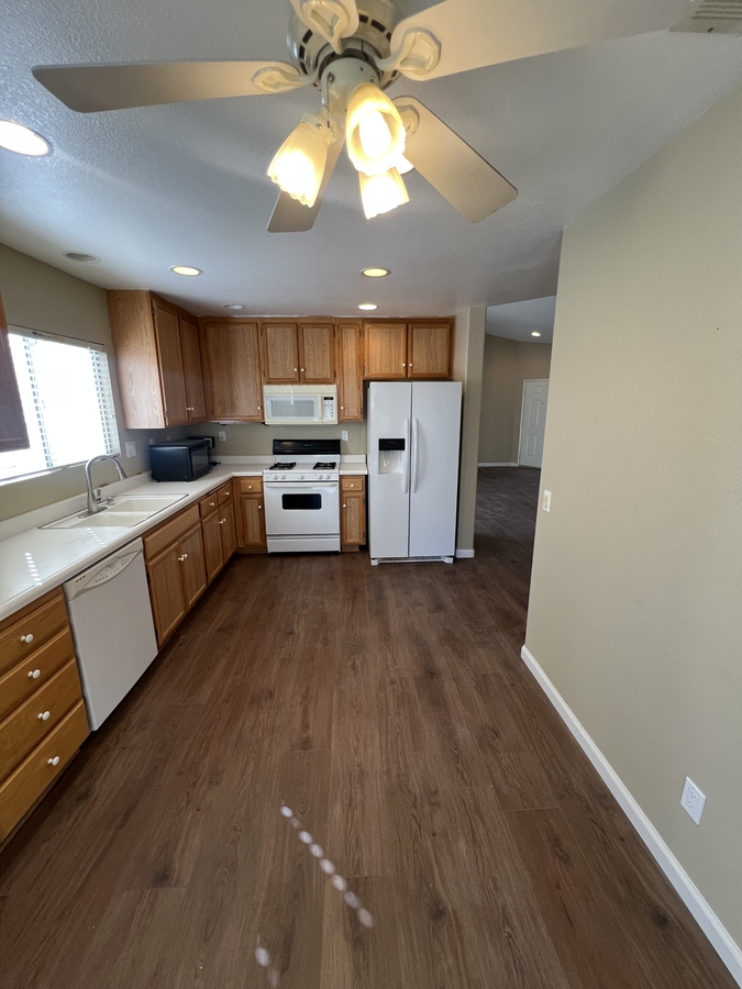 Welcome to this beautiful single-story home located in the highly desirable 55+ guard-gated community of The Colony in Murrieta. This well-maintained residence offers a spacious layout that includes two bedrooms, two bathrooms, and an additional office or den that can easily serve as a third bedroom. The home features new laminate flooring throughout, a brand-new HVAC system, and comes complete with a washer, dryer, and refrigerator for added convenience. The inviting family room offers vaulted ceilings, a cozy fireplace, and large windows that bring in plenty of natural light. A formal dining room provides additional flexibility and can be used as a study or secondary living area. The updated guest bathroom includes a new vanity and a tub/shower combo, while the primary suite offers a low-step shower, dual-sink vanity, and a spacious walk-in closet. The kitchen provides direct access to the backyard, ample cabinet space, and a ceiling fan. The backyard is beautifully landscaped with artificial turf, manicured shrubs, and a covered patio—perfect for relaxing or entertaining. The home also includes an attached two-car garage.