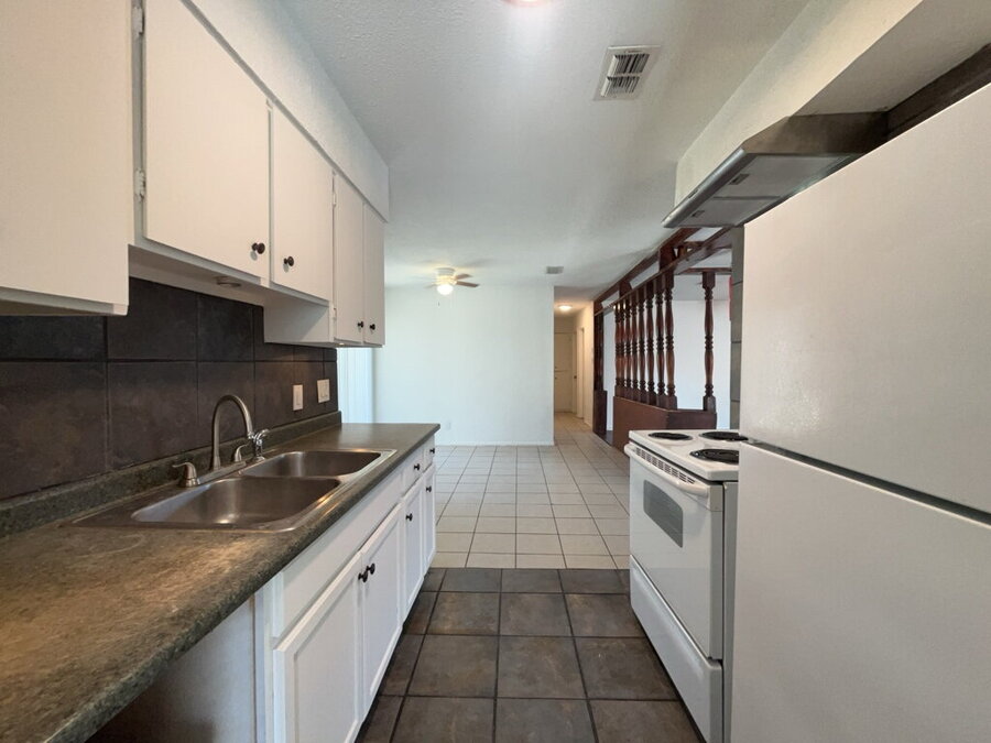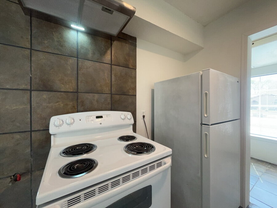 The kitchen is designed for everyday convenience and easy meal preparation, featuring an eat-in dining area, electric stove, refrigerator, pantry, and solid countertops that provide plenty of workspace.