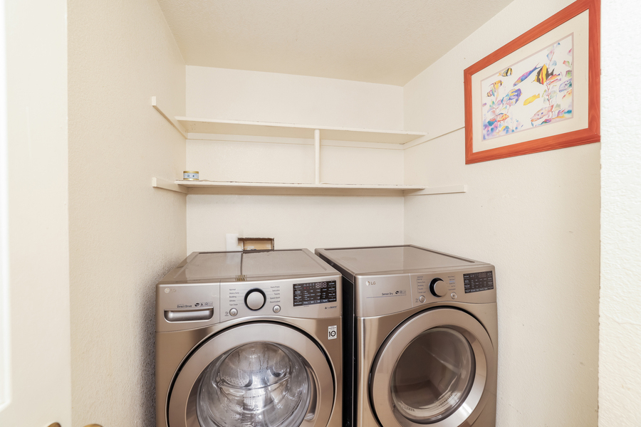 The home is move-in ready with complete furnishings, including a spacious living room setup with a large TV, a full dining set, and well-equipped bedrooms with king and queen beds. The kitchen comes stocked with essential cookware and appliances, while in-unit laundry, central heating, and generous storage make daily living easy.