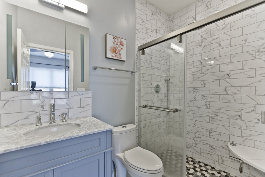 Rarely available multi-level 2 bedroom + den, 2.5 bath townhome with attached 2 car garage in an awesome location near Clybourn Corridor and only minutes to Old Town! Great floor plan offers ground floor den/office with half bath. The kitchen on the second floor features all white soft close shaker cabinets, stainless appliances, quartz countertops, marble backsplash, and an island and a good sized dining area that would be perfect for entertaining. East and West facing floor plan with walls of windows and Juliette balcony bring in lots of natural light on all levels of the home. Primary bedroom features two walk-in closets and a fully remodeled bathroom with Grohe rainshower and handheld with thermostatic plumbing for precise temperature control. Marble vanity and in-wall medicine cabinet has extra storage and outlets behind the LED anti-fog mirror. Second bedroom would easily accommodate a king sized bed and also offers great closet space. Hardwood floors in living areas, newer carpet in bedrooms, custom lighting and dimmers throughout. Cats and dogs are okay with pet fees. Perfectly positioned near New City, Mariano's, Whole Foods, and a wealth of shopping and entertainment options. Halsted and the North/Clybourn Red Line are just steps away, and you're only a 5-minute drive to 90/94. Permit parking right out front ensures easy guest parking.
