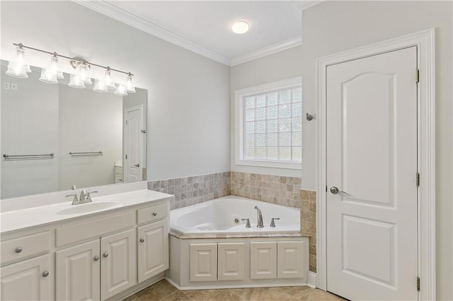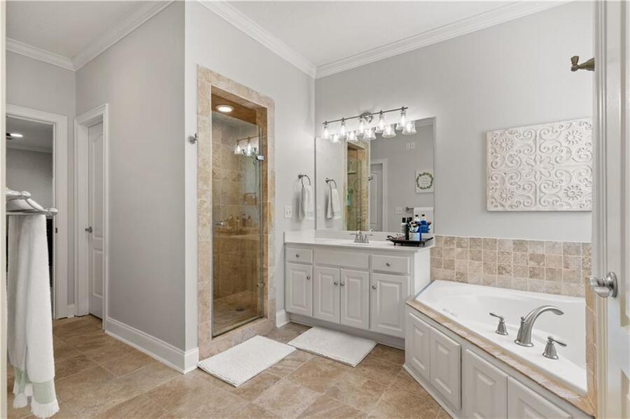 The primary bedroom is on the main level and includes a large ensuite bathroom with a walk in shower and separate bath tub.