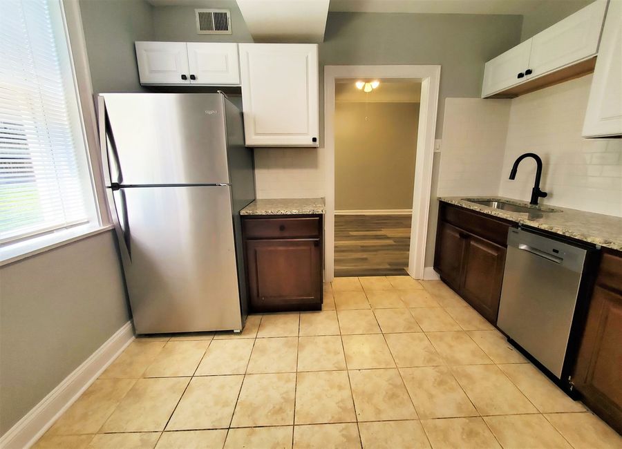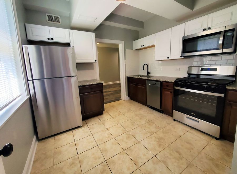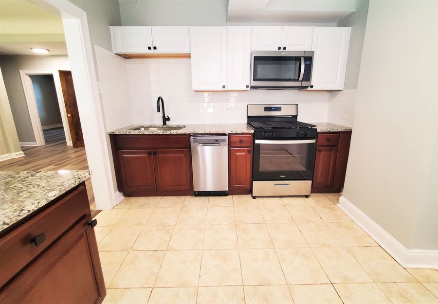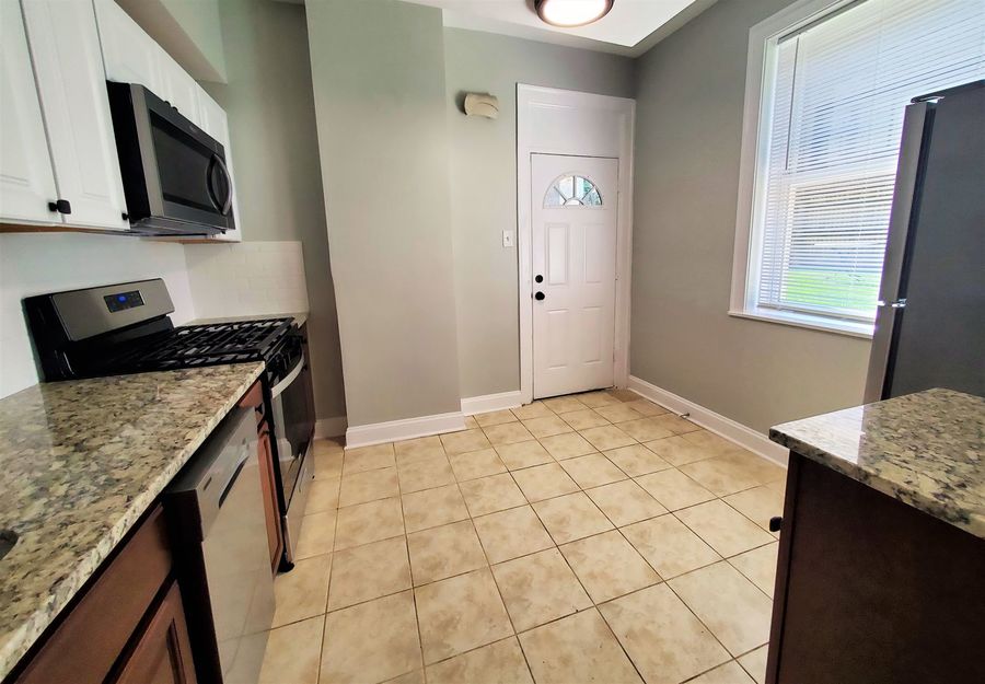 • Stainless-steel appliances include a refrigerator, gas range, dishwasher & built-in microwave.