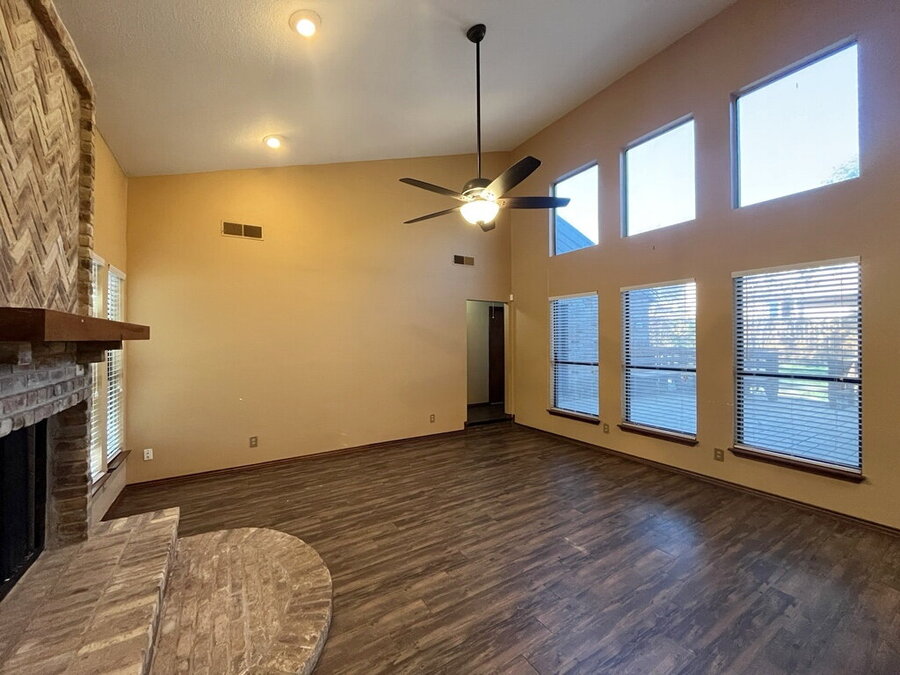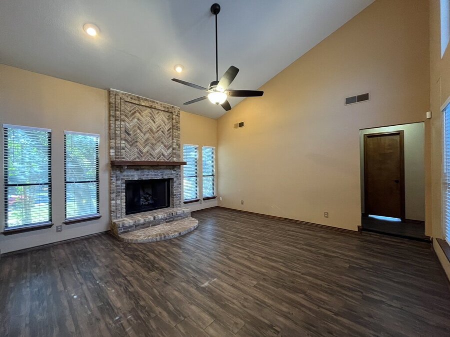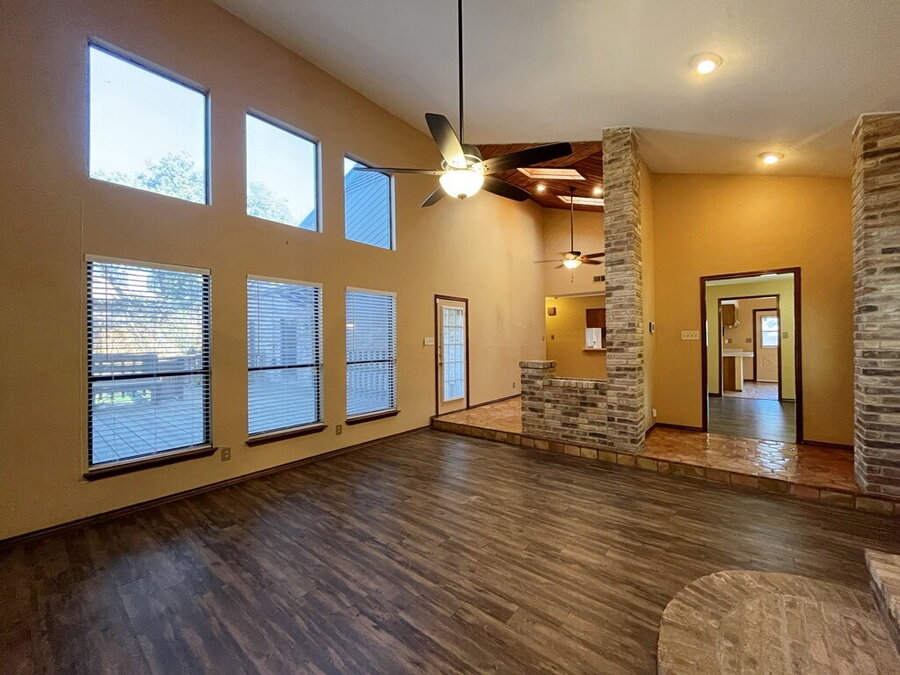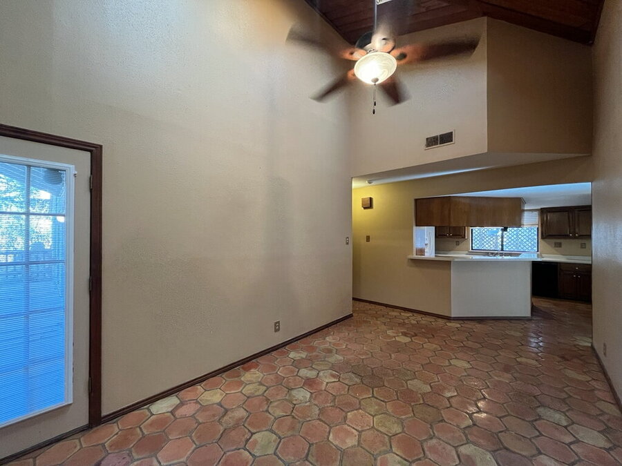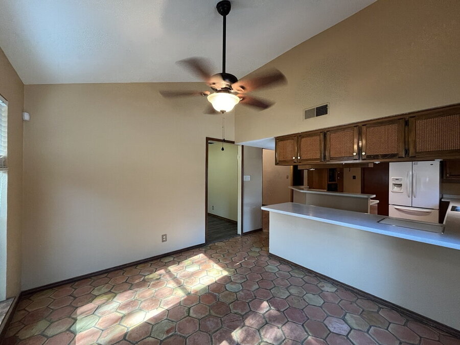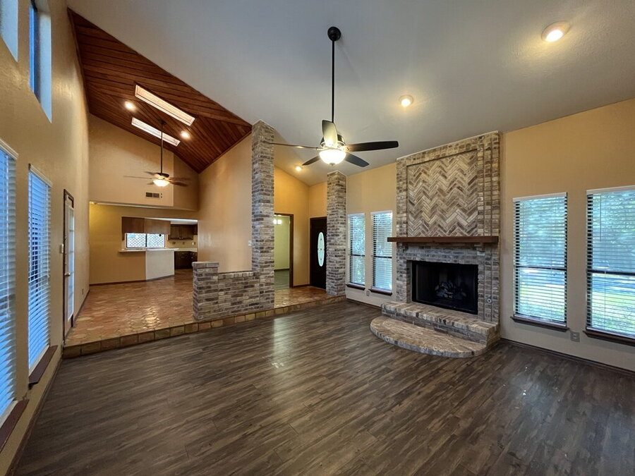 Inside, the home welcomes you with a sunken living room featuring luxury vinyl plank flooring, a striking brick fireplace, skylights, and abundant natural light from the backyard. Vaulted ceilings enhance the open feel, while a mix of carpet, ceramic tile, Saltillo tile, and vinyl flooring adds warmth and character throughout. Two living areas and two eating areas offer versatility for daily living and entertaining.