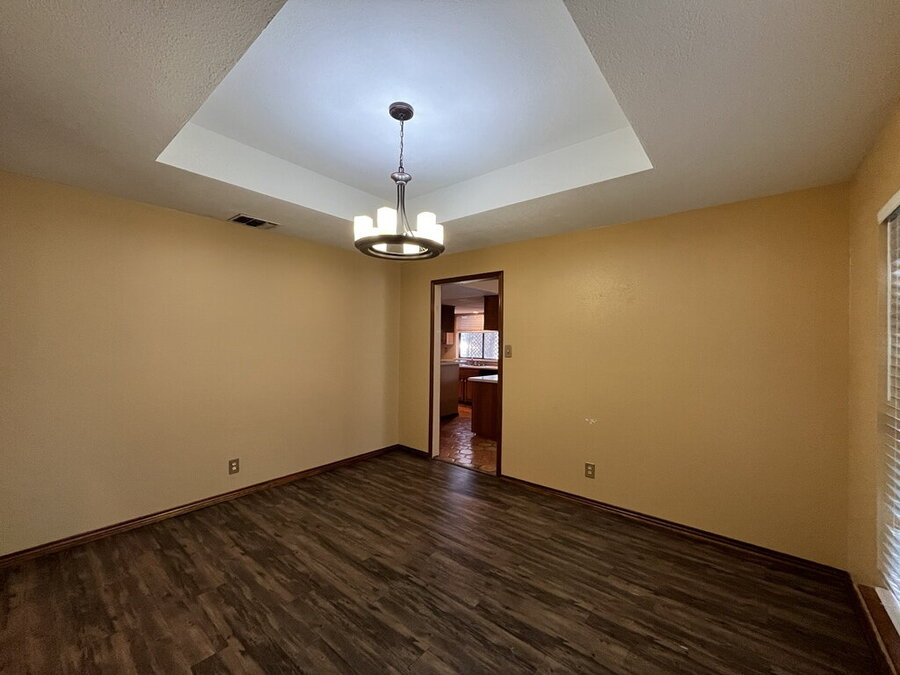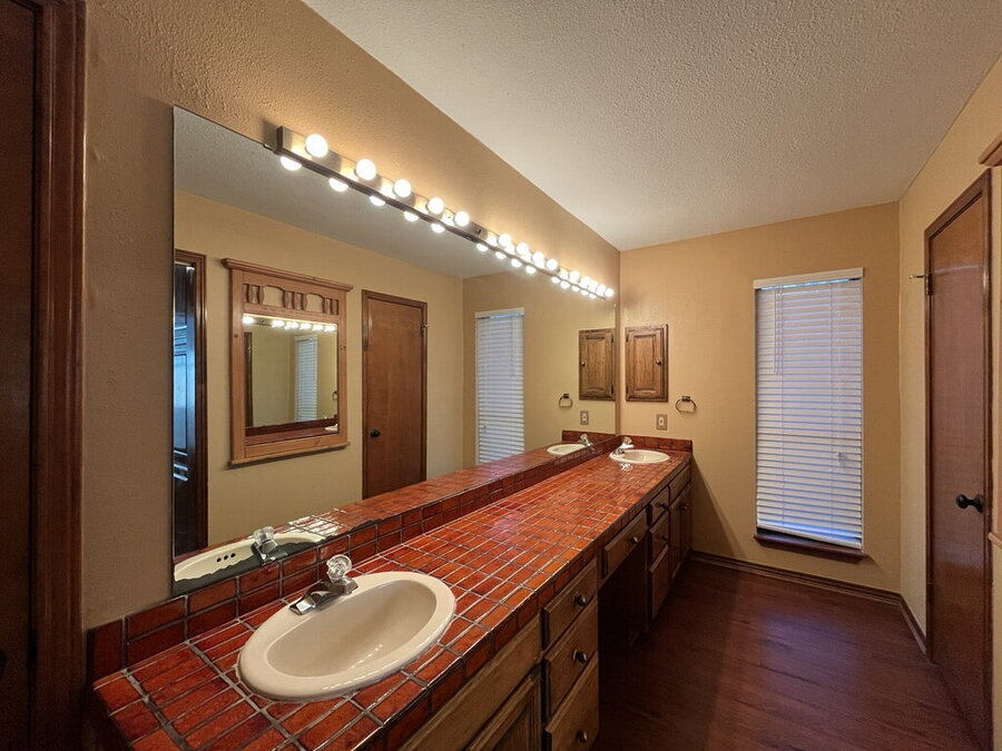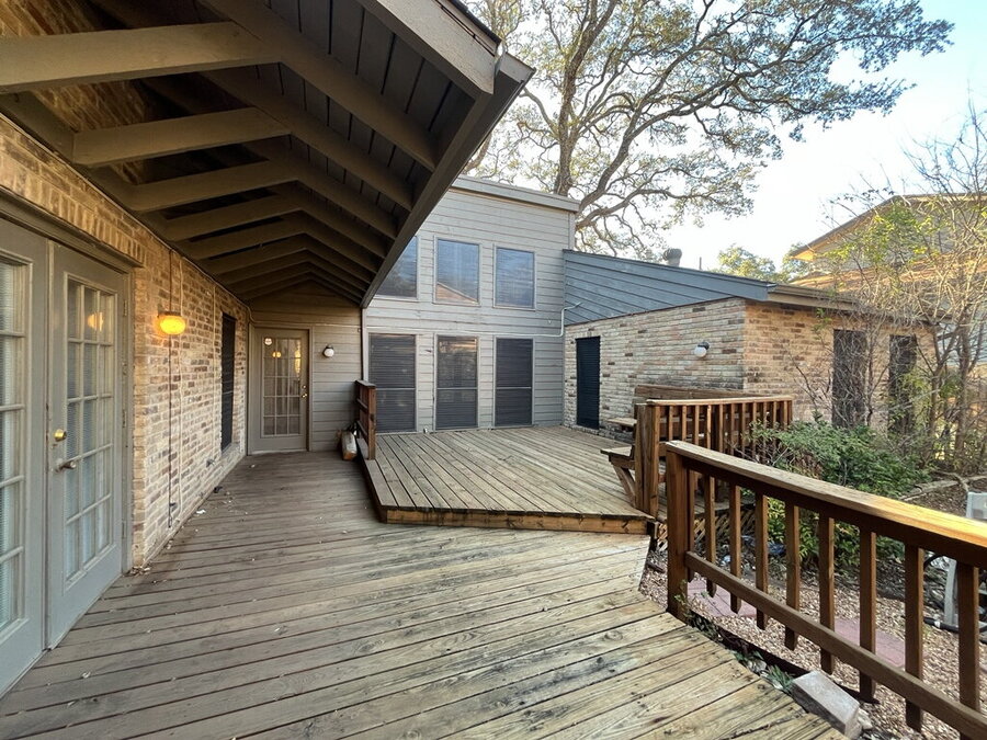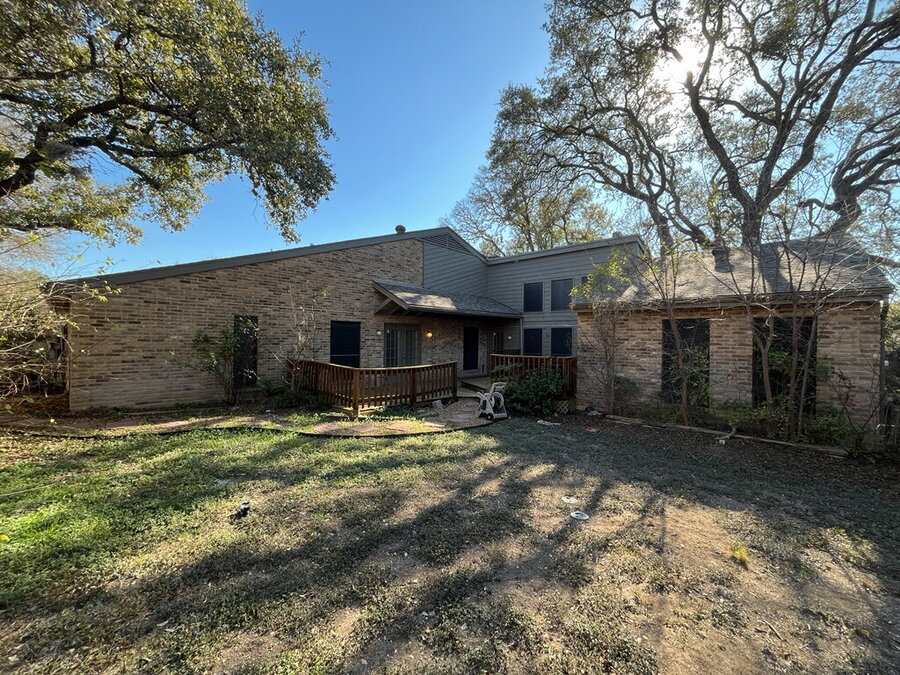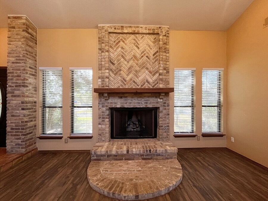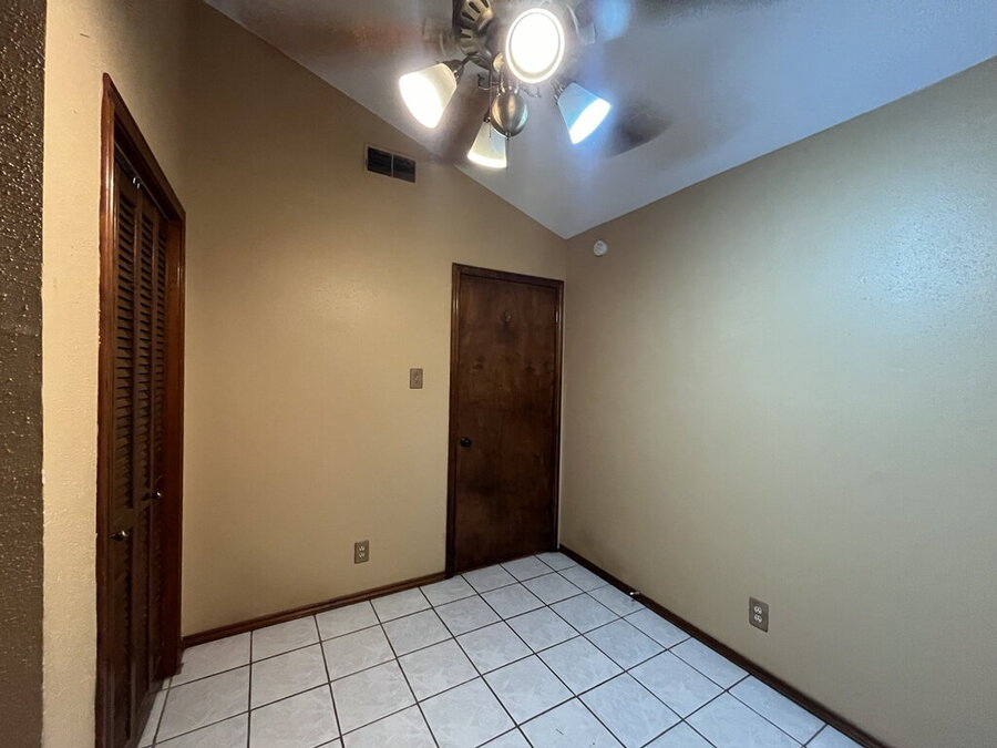 Inside, the home welcomes you with a sunken living room featuring luxury vinyl plank flooring, a striking brick fireplace, skylights, and abundant natural light from the backyard. Vaulted ceilings enhance the open feel, while a mix of carpet, ceramic tile, Saltillo tile, and vinyl flooring adds warmth and character throughout. Two living areas and two eating areas offer versatility for daily living and entertaining.