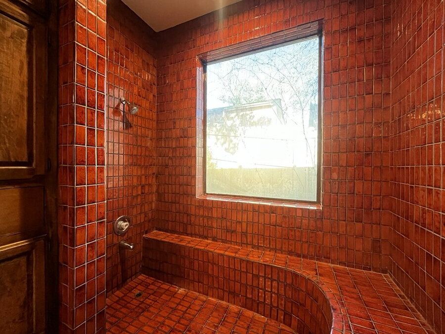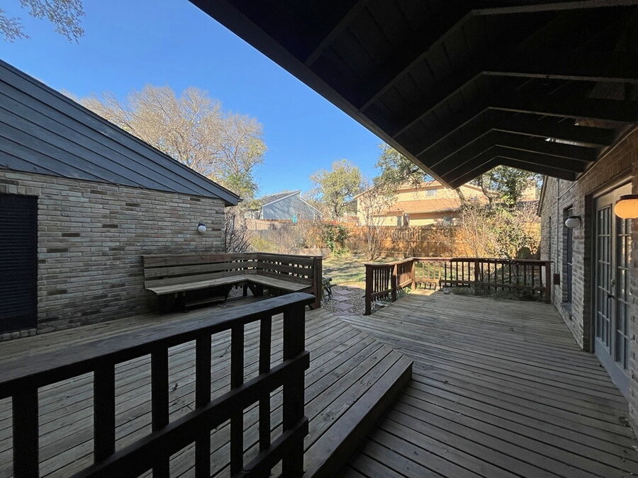 Two bedrooms and a full bath are located off the living room, while a third bedroom, half bath, and the primary bedroom are tucked down a private hallway. The primary bedroom features vaulted ceilings and French doors that open to the covered back patio and yard. The ensuite bath includes a double vanity with a powder desk area, a large Roman tub/shower accented with beautiful vintage tile, and a walk-in closet with built-in shelving.