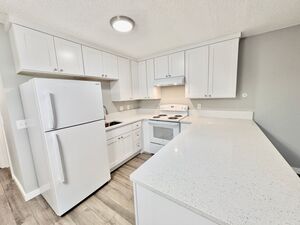 Retreat to the spacious, sunlit sleeping area, thoughtfully separated from the main living room for peace and privacy. The large bathroom is a true oasis, boasting a sleek walk-in shower with modern subway tiling and a quartz countertop sink. For ultimate convenience, a full-size washer and dryer are included in the in-unit laundry area.