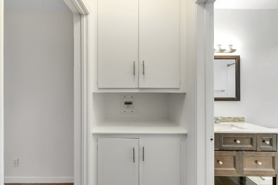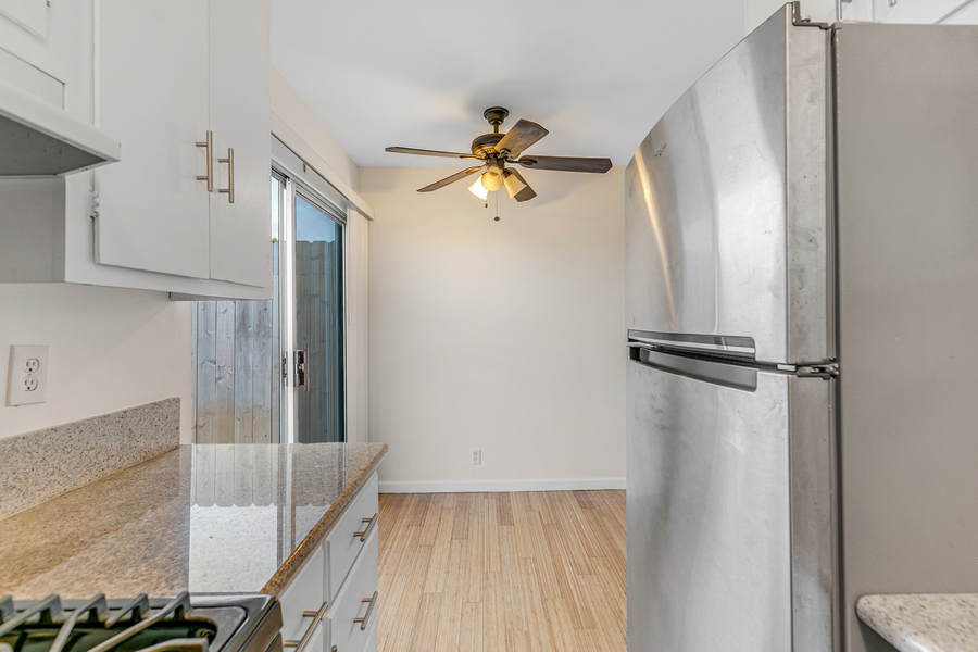 Inside, you’ve got clean lines, warm wood floors, a cute galley kitchen with plenty of storage, and an open living/dining area that flows right out to the patio (hello indoor-outdoor vibes). The bedroom is sunny and chill, the bathroom is fresh and simple, and there’s even a linen nook for your towels and trinkets.