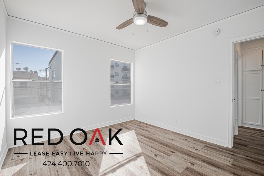 ~ Serene Bedroom: Featuring sunny windows, a breezy ceiling fan, and large closet.