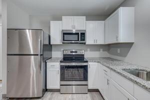 Complete kitchen with refrigerator, dishwasher, and free-standing range