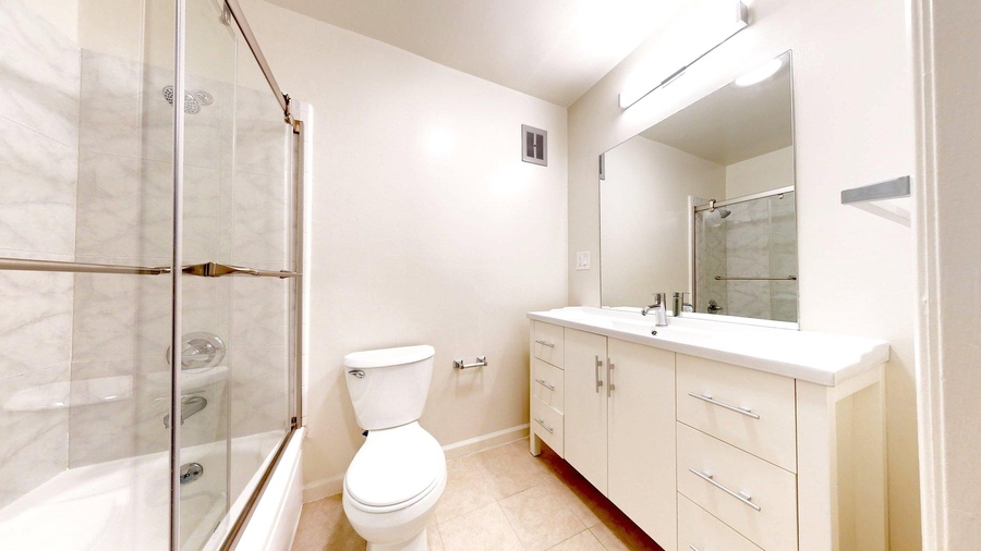 • Contemporary bathroom with glass-enclosed shower/tub combination