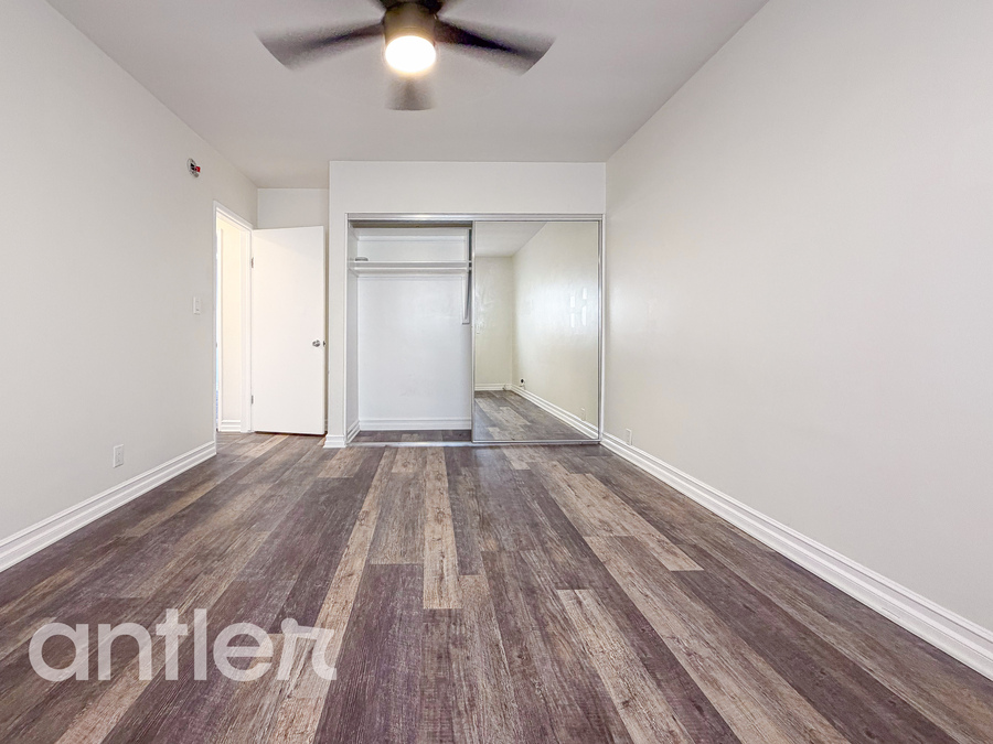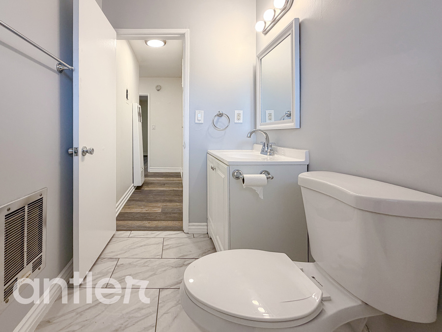 The open layout features a contemporary kitchen equipped with quartz countertops, a dishwasher, stove, fridge, and a breakfast bar perfect for both casual dining and entertaining. The fully renovated bathroom is a retreat in itself, featuring floor-to-ceiling upgrades and modern fixtures. Ample closet space throughout the apartment ensures all your storage needs are met.