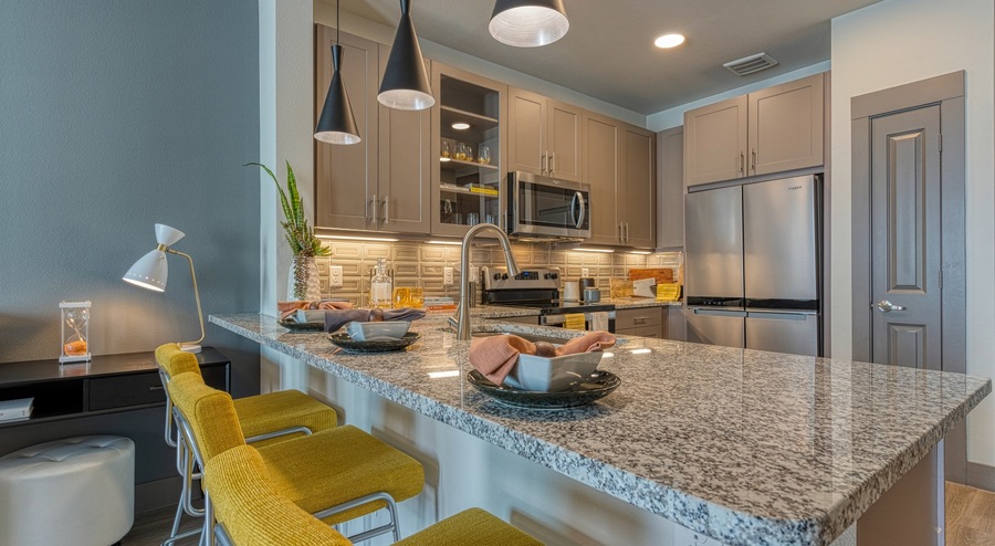 Experience the perfect blend of modern comfort and urban living in a community designed to meet your every need. These spacious apartments feature open-concept layouts with high-end finishes, including quartz countertops, stainless steel appliances, and wood-style flooring. Large windows flood each home with natural light, while private patios or balconies offer a serene space to relax and enjoy the surroundings.