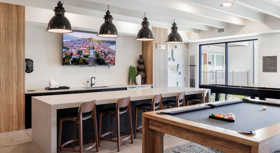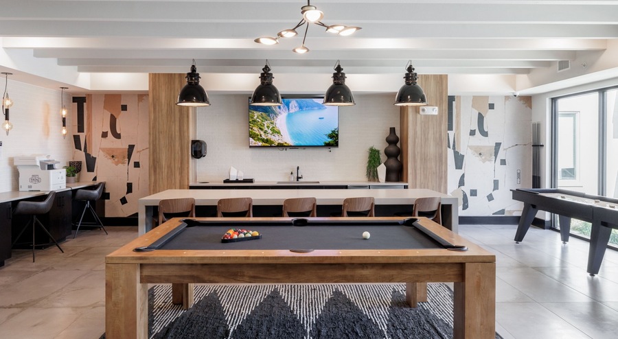 Clubroom with TVs, kitchen, coffee bar, and billiards