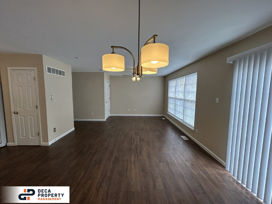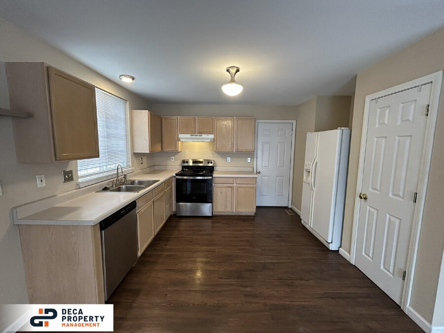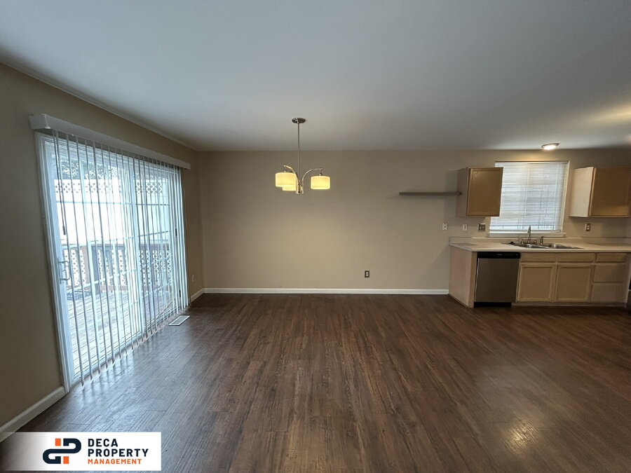 The dining area showcases a custom light fixture and sliding glass doors that lead to the rear deck, perfect for relaxing or entertaining. The kitchen offers ample cabinet and counter space and comes fully equipped with a refrigerator, dishwasher, oven, and sink with garbage disposal.