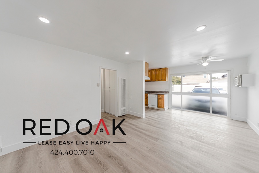 ~ Open & Airy: Hardwood-style floors, enhanced by recessed lighting.