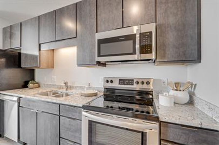 Quartz countertops, stainless steel appliances and in-unit laundry