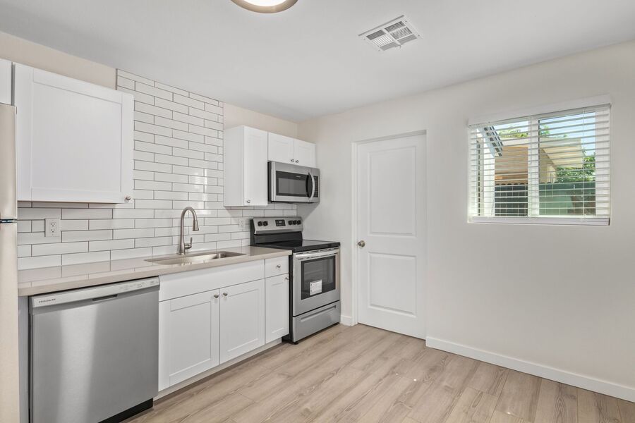 Kitchens: Enjoy the charm of quartz countertops, white shaker cabinets, stainless steel appliances, and elegant white subway tile backsplashes.
