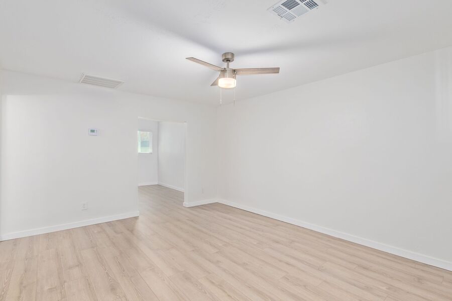 Living Spaces: The light, wood-styled flooring creates a warm and inviting atmosphere, seamlessly leading into spacious bedrooms that easily accommodate a king-sized bed and nightstands.