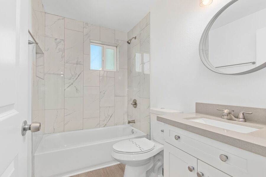 Bathrooms: Indulge in luxurious features like marbled shower backsplashes, decorative round mirrors, and consistent quartz countertops, white cabinets, and stylish flooring throughout.